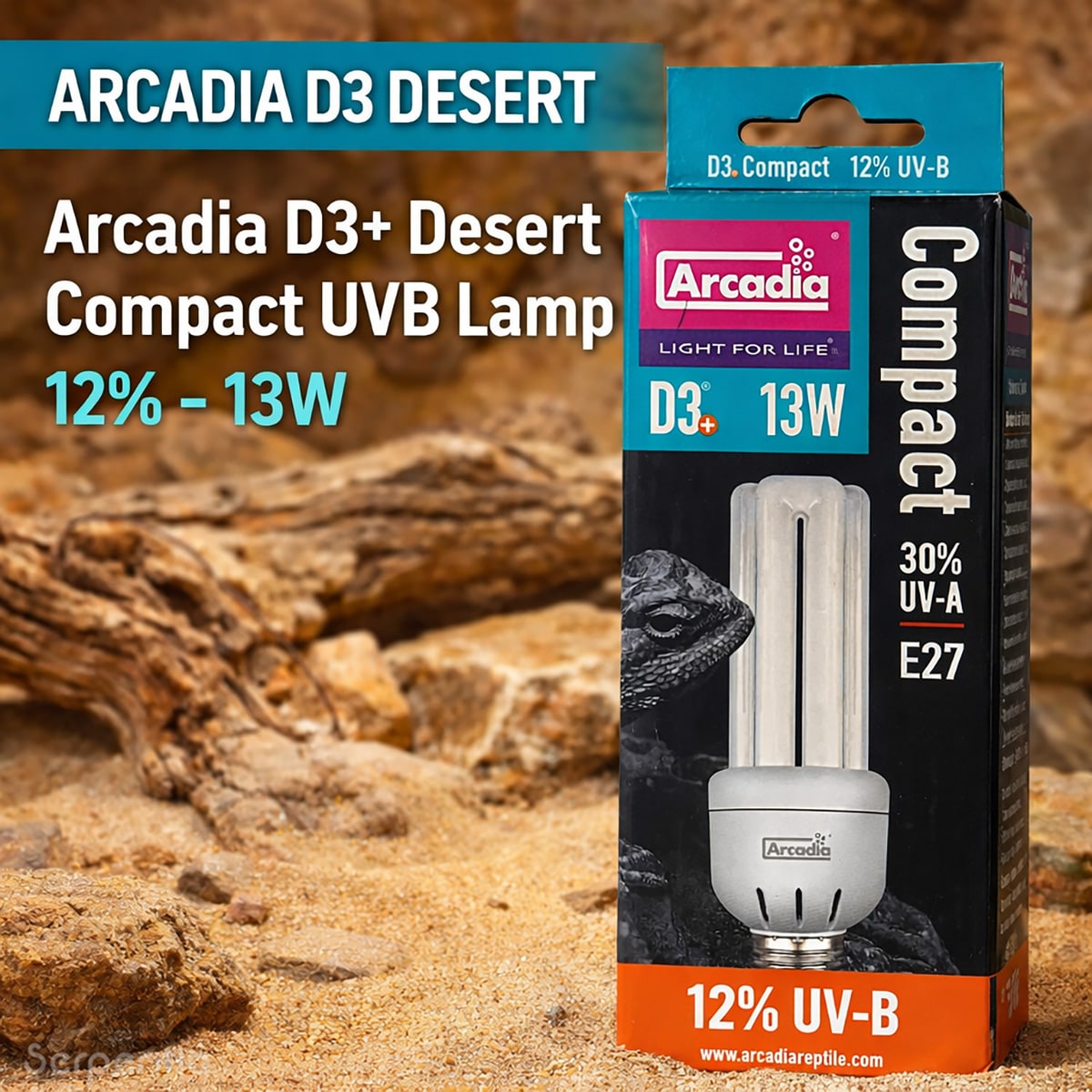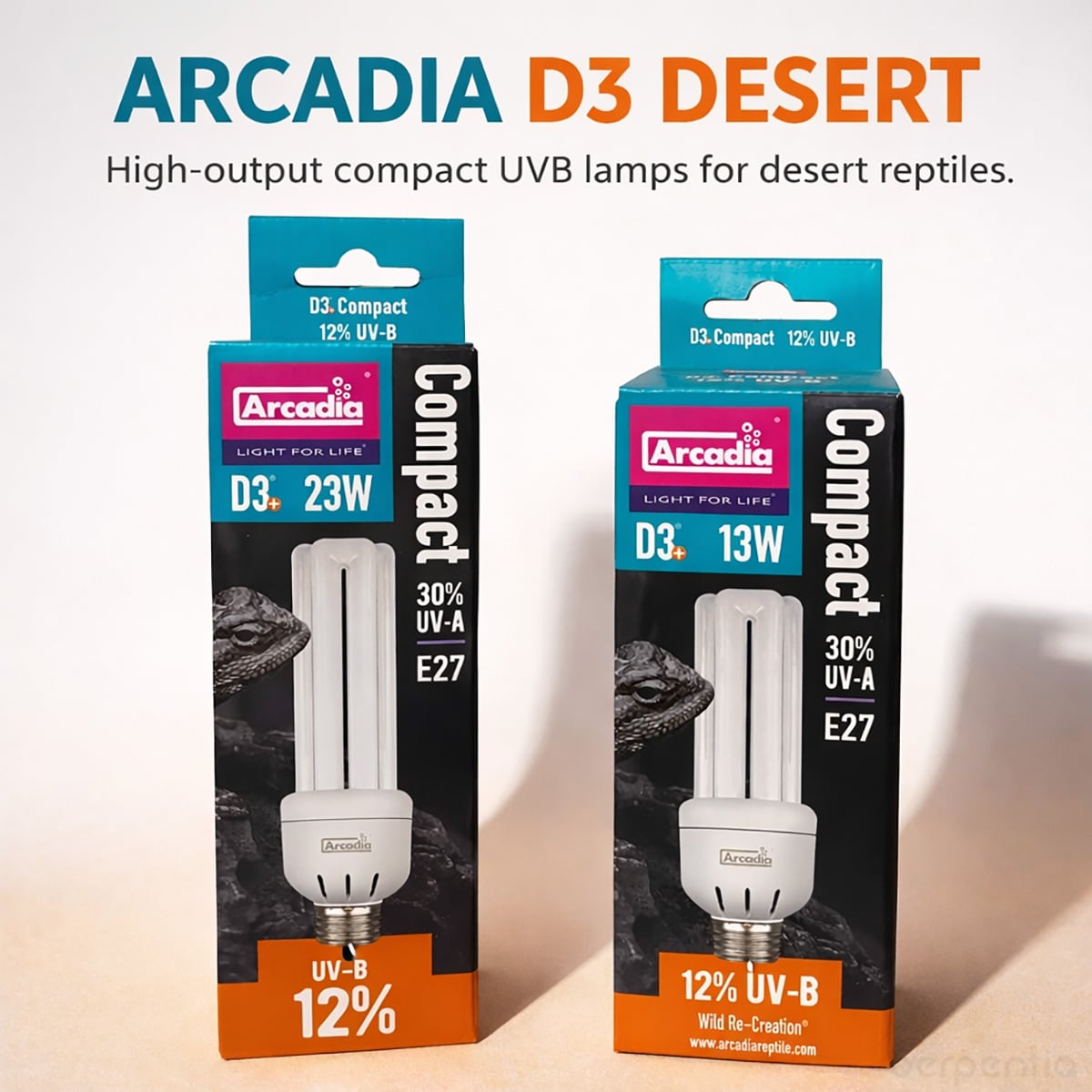The Arcadia D3+ Desert Compact UVB Lamp 12% – 13W is a full-spectrum compact fluorescent lamp designed to simulate natural sunlight for desert and arid-habitat reptiles. It provides a higher 12% UVB output to support natural vitamin D3 synthesis, alongside 30% UVA to encourage normal behaviour, appetite, and colour perception.