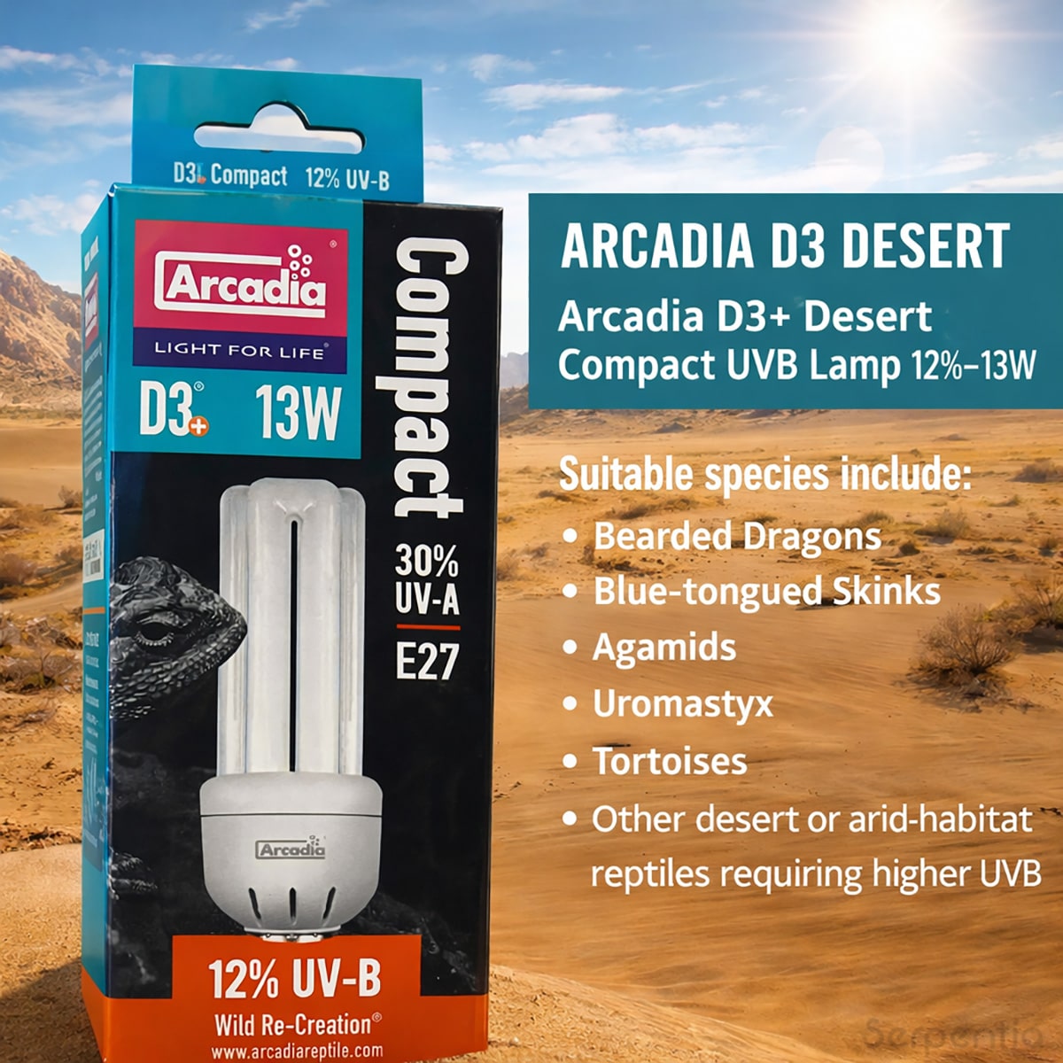 Which reptiles is the Arcadia D3+ Desert 12% Compact UVB 13W suitable for?