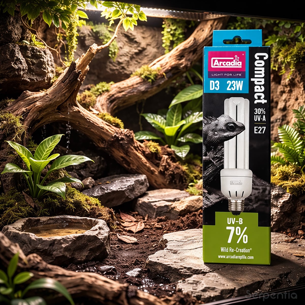 The Arcadia D3 Forest Compact UVB Lamp 7% – 23W is a full-spectrum compact fluorescent designed to simulate natural sunlight for forest and mixed-habitat reptiles. It provides 7% UVB to support natural vitamin D3 synthesis, plus 30% UVA to encourage normal activity and colour perception.