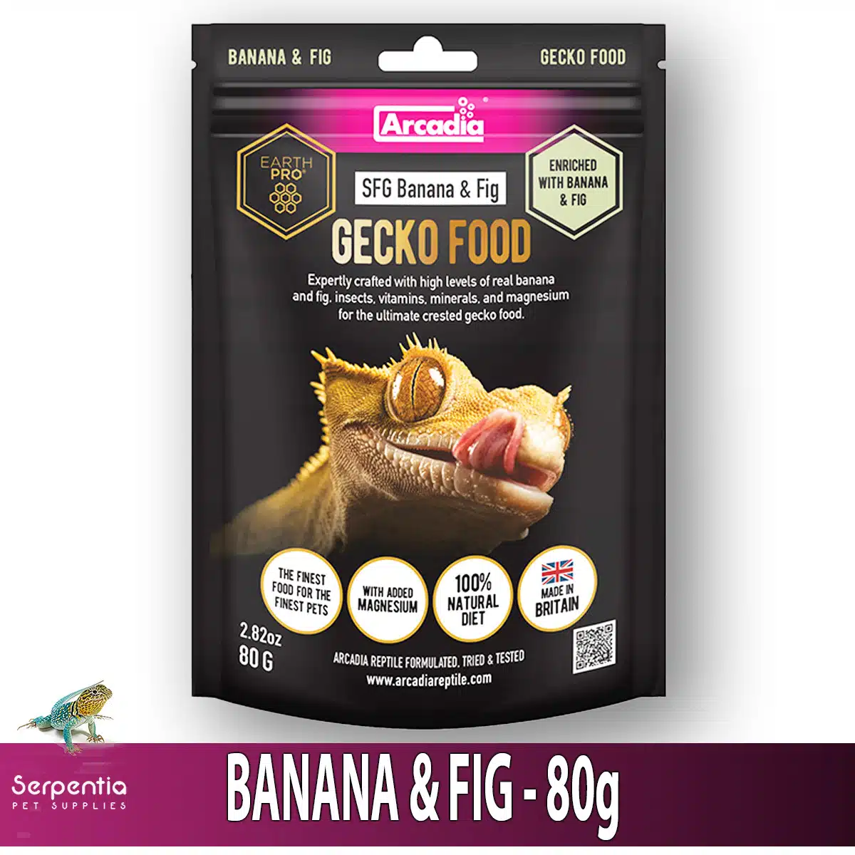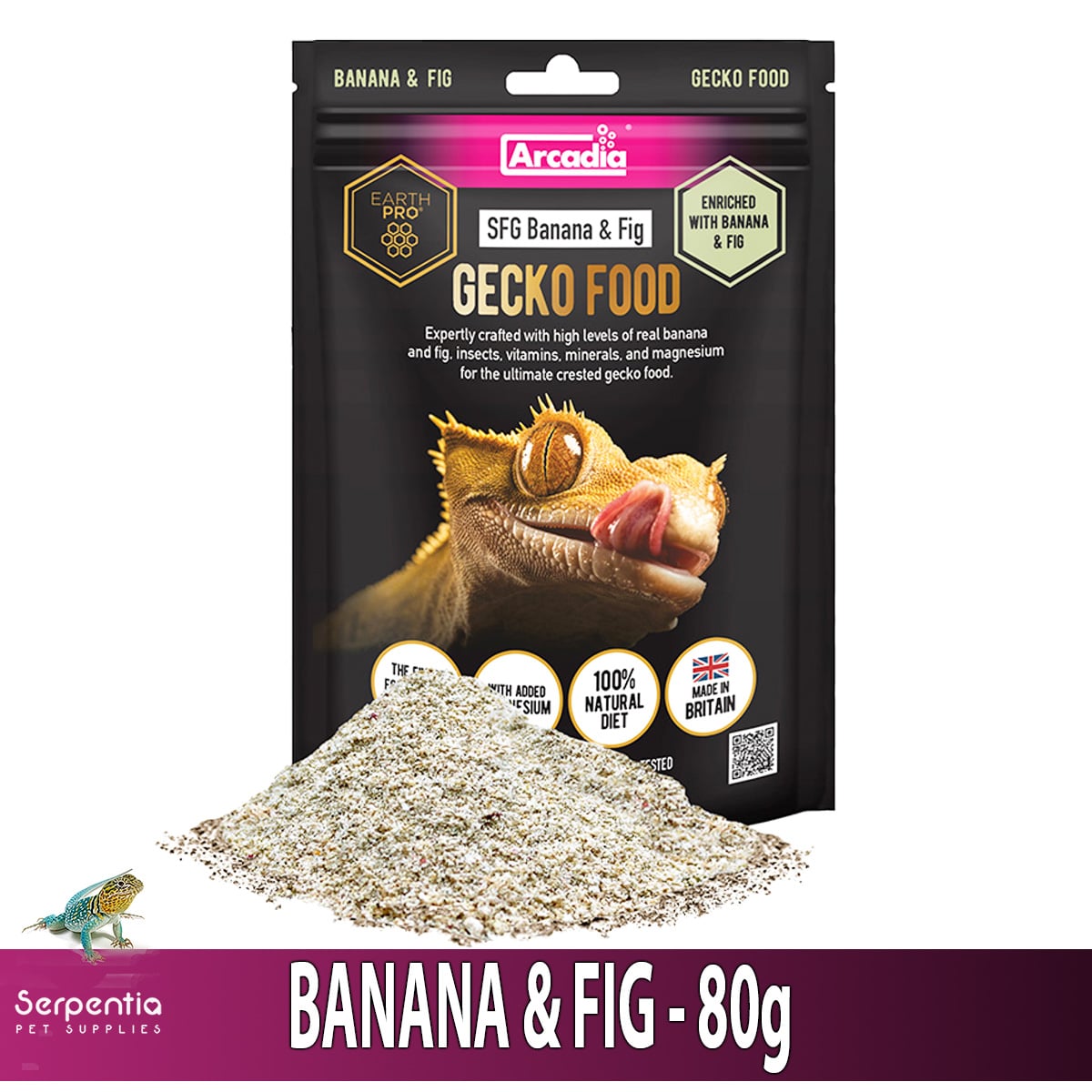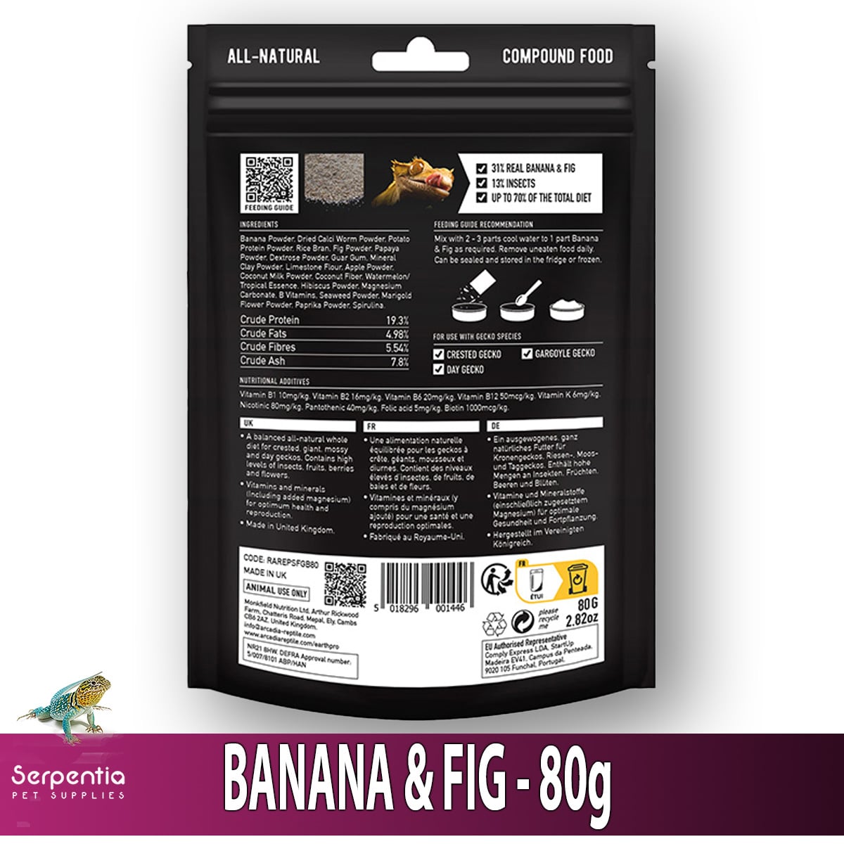 • Natural banana & fig formula with added calci-worm powder — highly palatable for geckos.