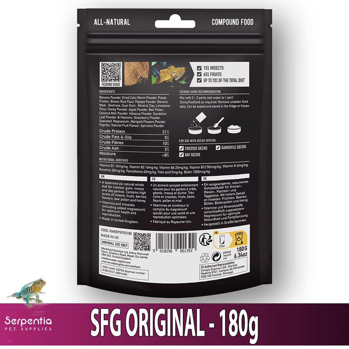 Arcadia Sticky Foot Gold Original is a complete, fruit-based meal replacement diet for Crested Geckos and other New Caledonian species. Made with a balanced blend of natural fruit powders, plant matter, flowers and dried calci-worm powder, it provides wholesome daily nutrition without added artificial colours or flavours.