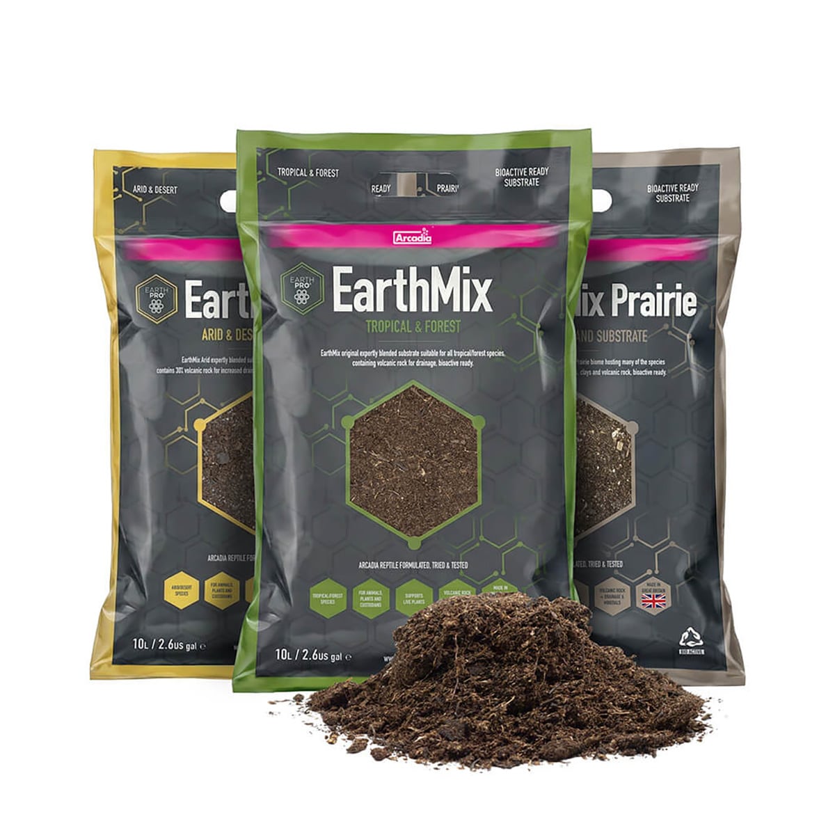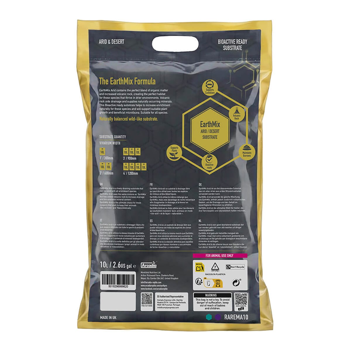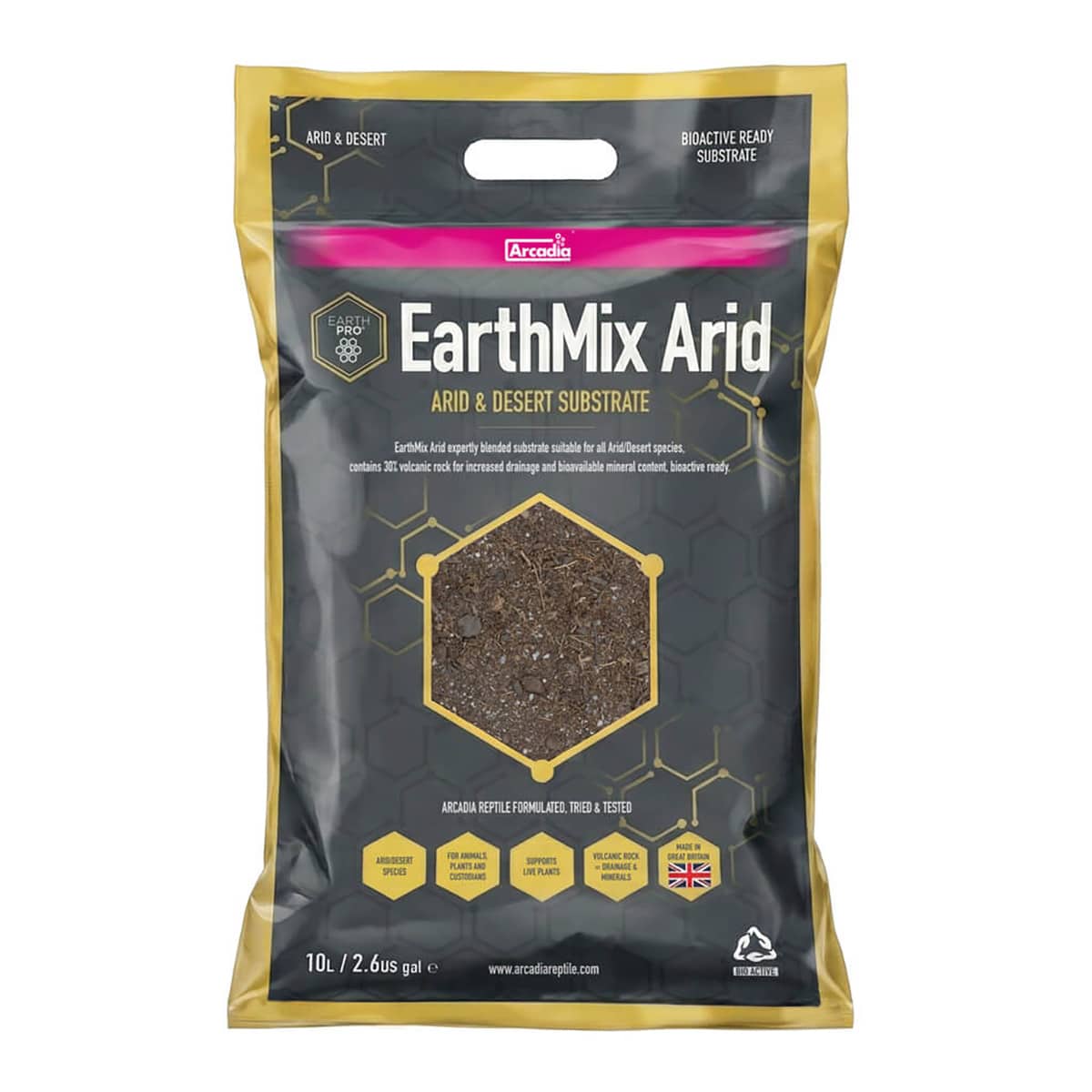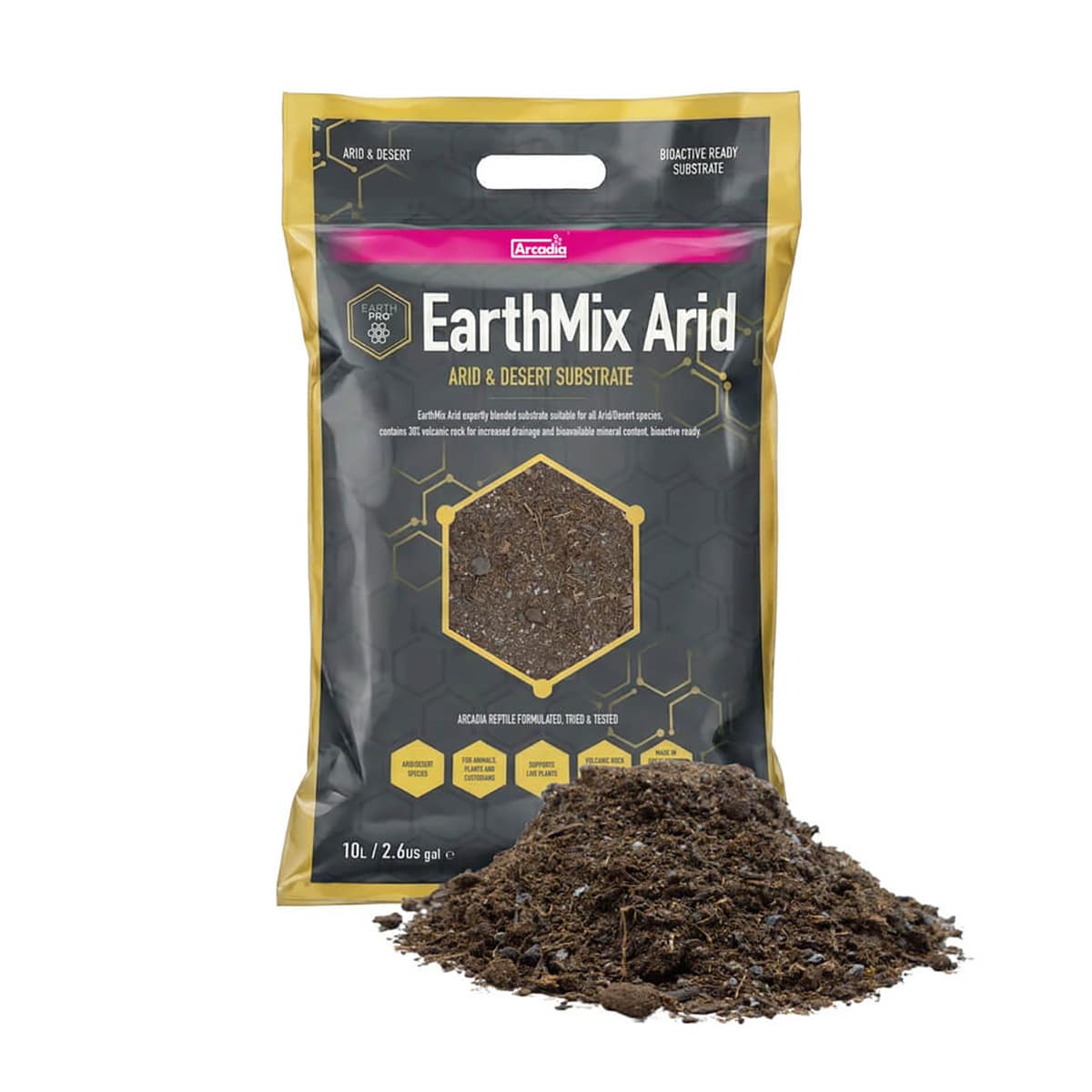 Arcadia EarthMix Arid is a naturalistic, bio-active ready substrate designed for reptiles and amphibians from arid and desert habitats. This specialist blend uses the same organic base as Arcadia EarthMix, but with added organic volcanic rock to increase drainage and boost bio-available mineral content.