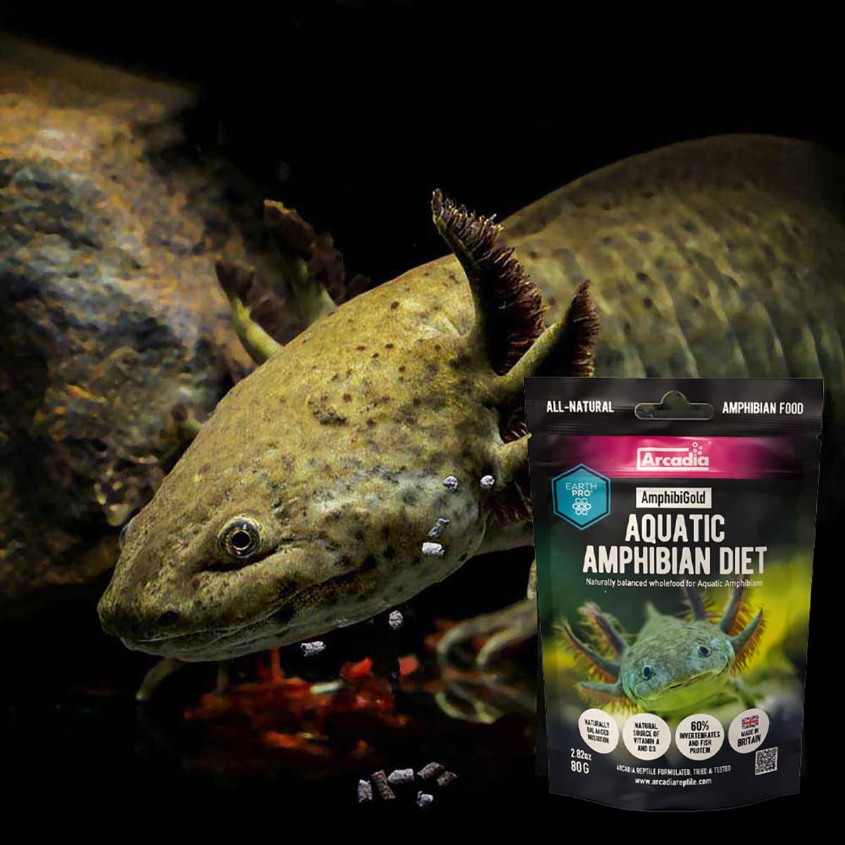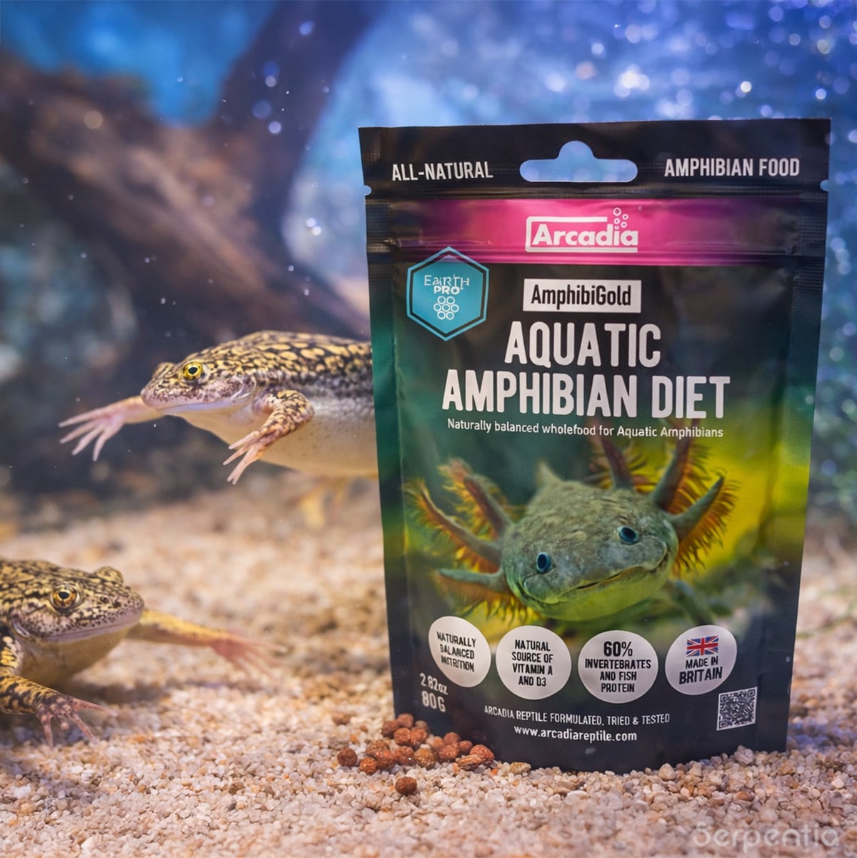 Arcadia EarthPro AmphibiGold is a natural, nutrient-rich small pelleted diet for aquatic and semi-aquatic amphibians including Axolotls, Clawed Frogs, Newts, and Salamanders. Formulated with over 60% invertebrate and fish protein, it includes premium ingredients such as freshwater fish, earthworms, snails, bloodworms, brine shrimp, and daphnia. The recipe is easily digested, highly palatable, and enhanced with a natural probiotic to support gut health.