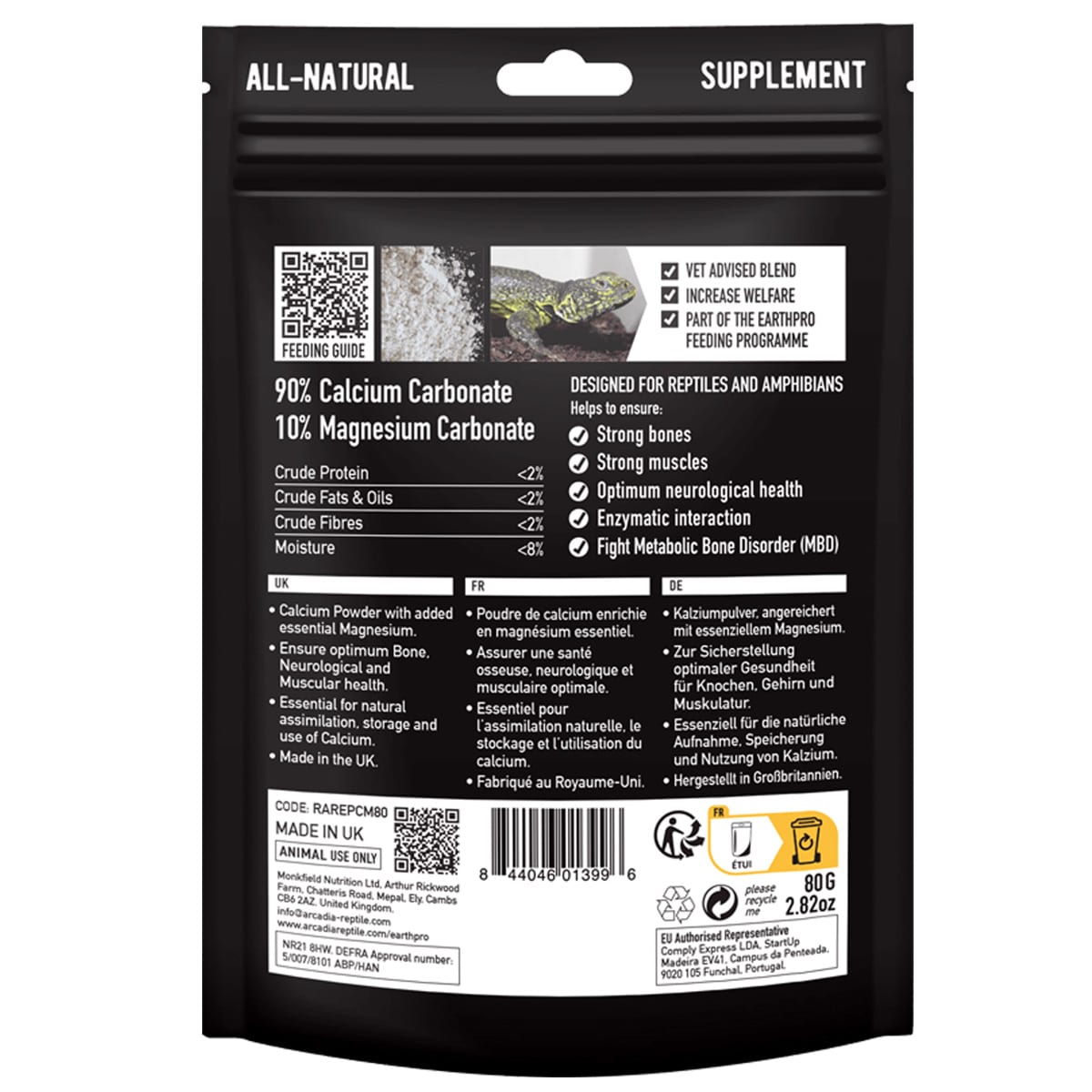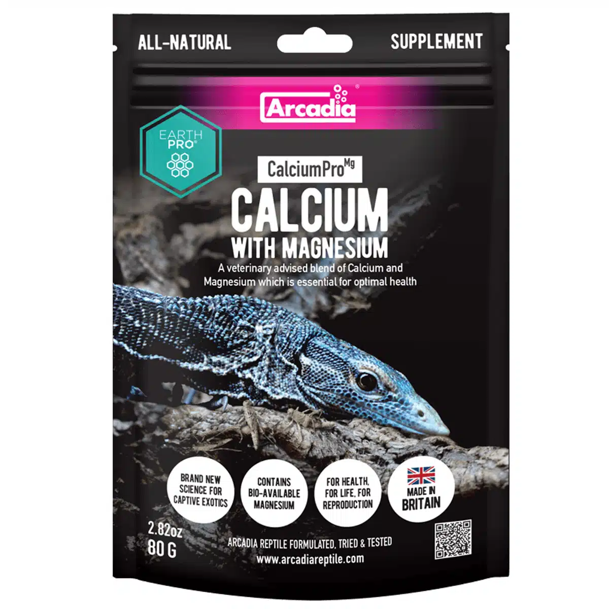 Arcadia EarthPro CalciumPro-Mg is a finely milled blend of pure calcium carbonate and magnesium carbonate, formulated for everyday use with reptiles and amphibians. These two minerals play an important role in maintaining a balanced diet, especially for species that rely on dusted feeder insects and fresh salads.