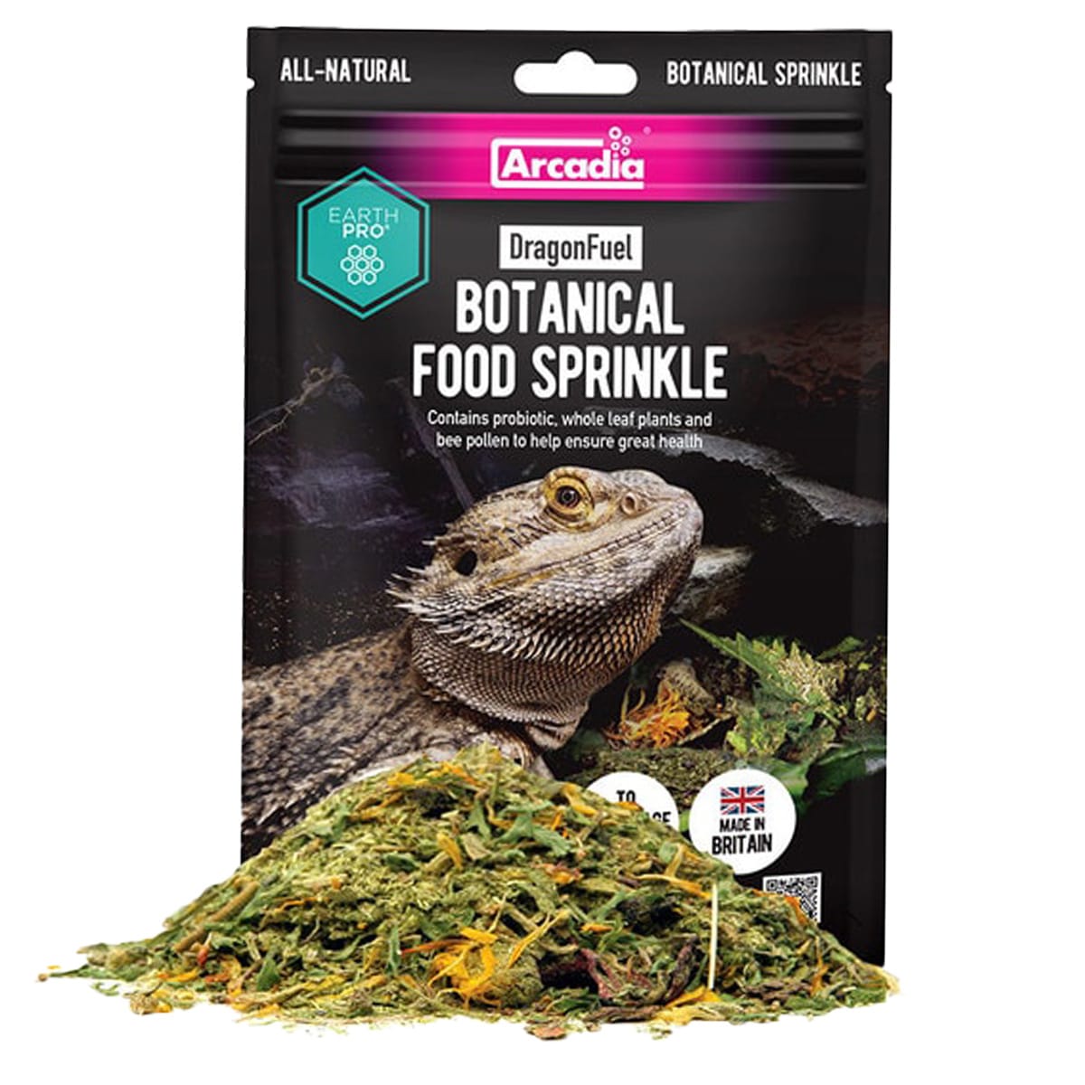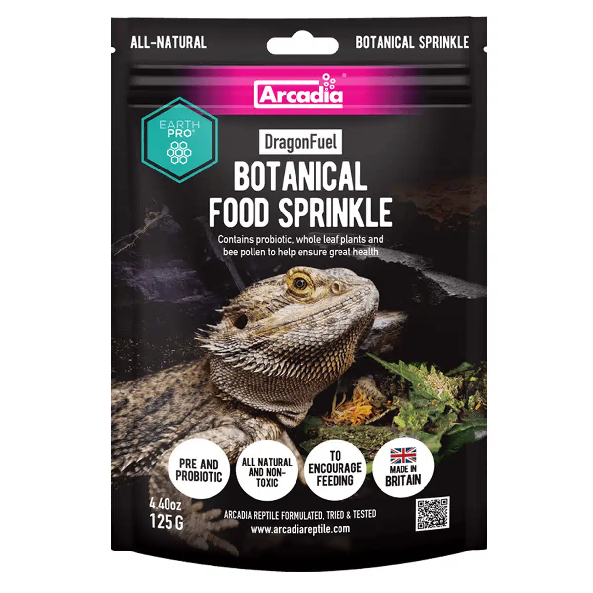 Arcadia EarthPro Dragon Fuel is a botanical food sprinkle developed for Bearded Dragons and other omnivorous or herbivorous reptiles. Made from a mix of leaves, flowers, herbs and plant materials with added vitamins, minerals, bee pollen and probiotics, it is designed to boost dietary variety and overall wellbeing when used alongside the main diet.