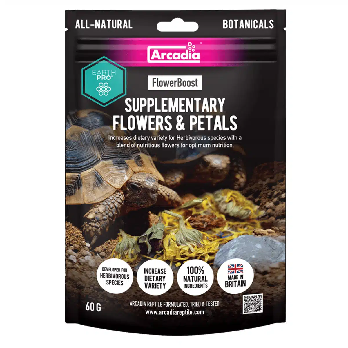Arcadia EarthPro FlowerBoost is a natural blend of flowers, petals and botanicals designed to enhance dietary variety for Bearded Dragons and other herbivorous or omnivorous reptiles. It is made from dried plant materials that closely mimic the nutritious blossoms and wild flora reptiles would encounter in nature.