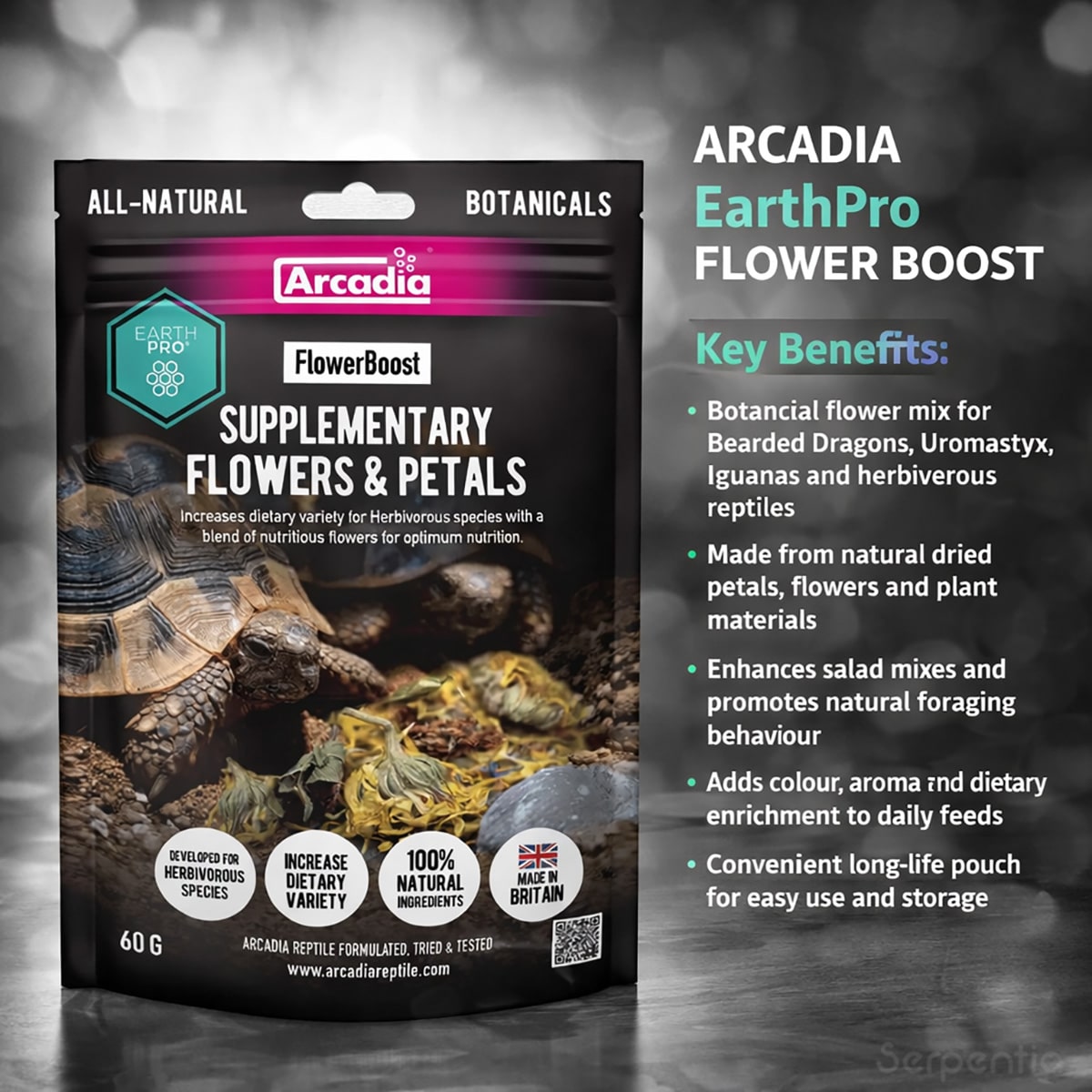 FlowerBoost can be added directly to fresh salads, vegetables or plant-based diets. Sprinkle lightly over meals or mix it through for more even distribution. Use it as part of a varied feeding routine that includes fresh greens, vegetables, occasional live foods for omnivorous species and other Arcadia EarthPro foods where appropriate. Adjust the amount to suit your reptile’s size, appetite and normal feeding routine. Store the pouch sealed in a cool, dry place.