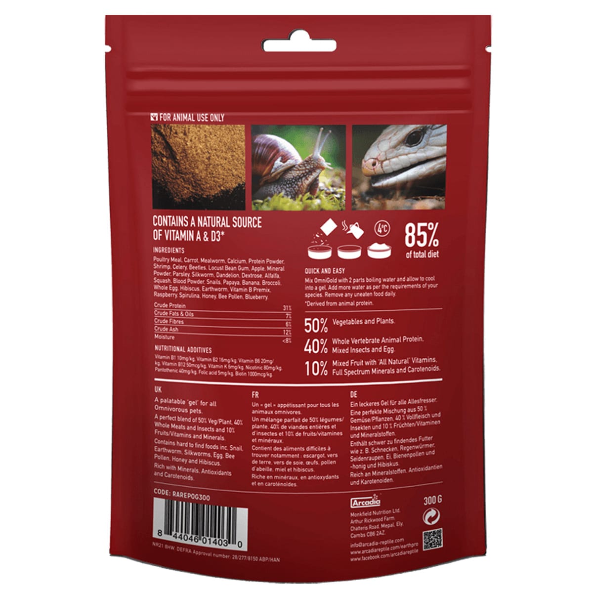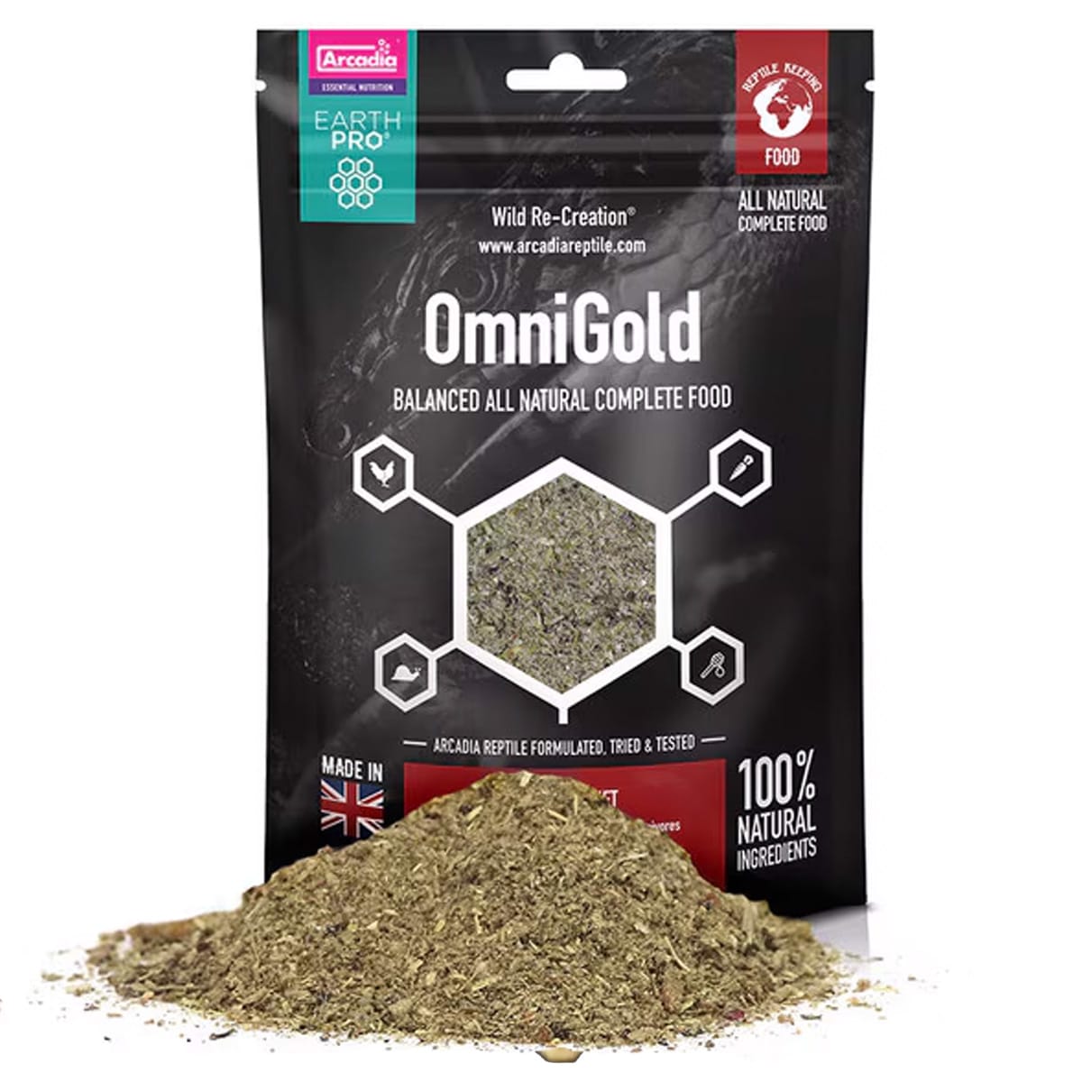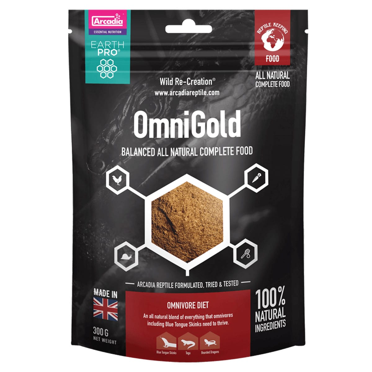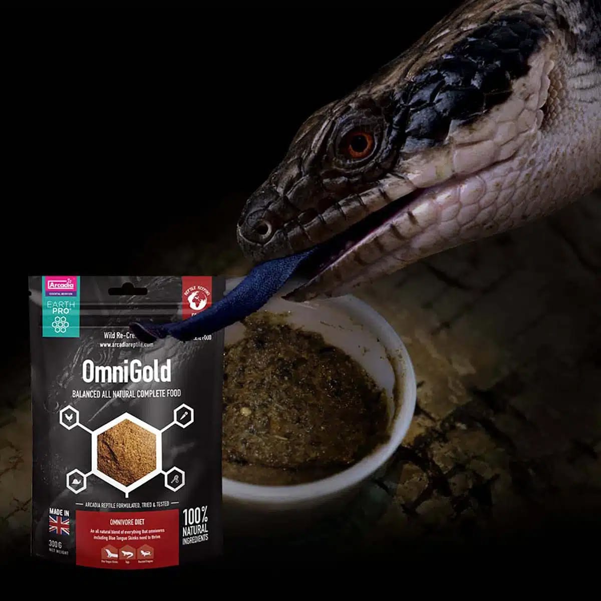Arcadia EarthPro OmniGold is a whole-food gel formula designed for omnivorous reptiles such as Bearded Dragons, Blue Tongue Skinks and Tegus. It combines vegetation, whole meats, insects, fruits, vitamins and minerals to support balanced nutrition, good condition and natural feeding behaviour.