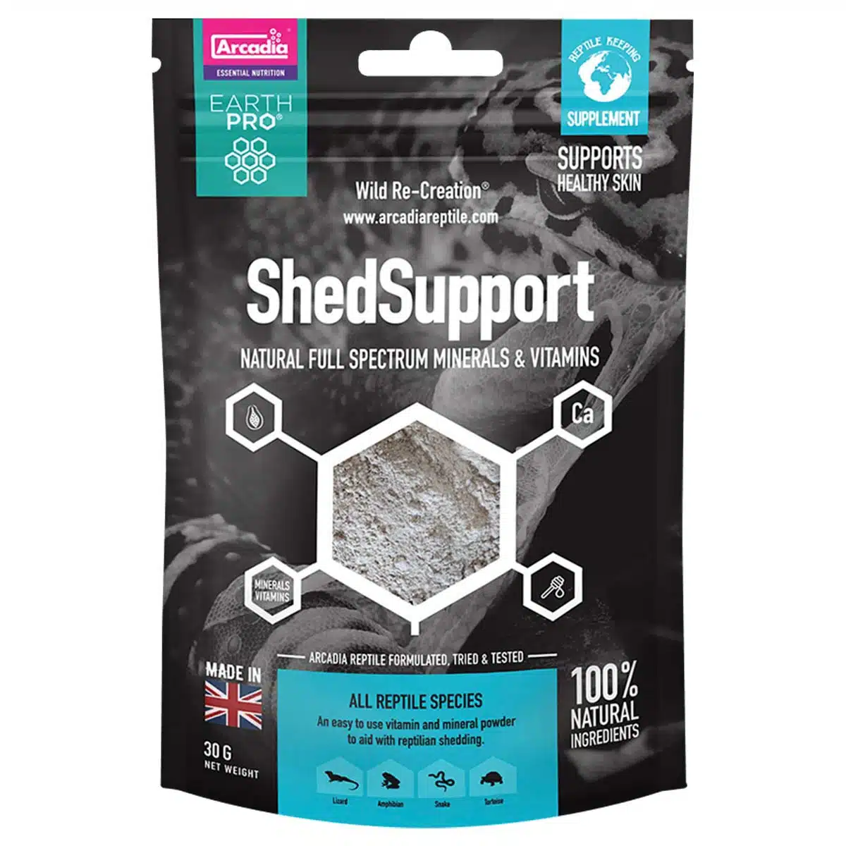 Arcadia EarthPro Shed Support is an easy to use natural, full spectrum Minerals and Vitamins powder to aid with reptilian shedding. A potent blend of natural plants, vitamins and minerals that are used for 5 days over the shedding cycle. includes Carotenoids and Bee Pollen.