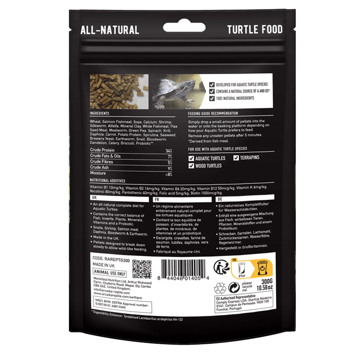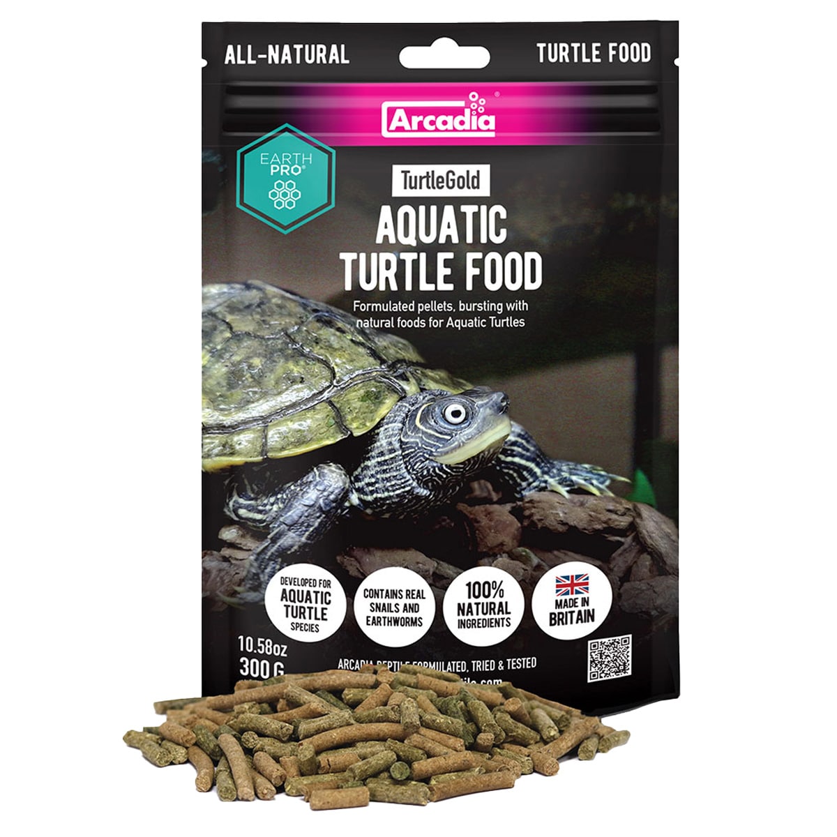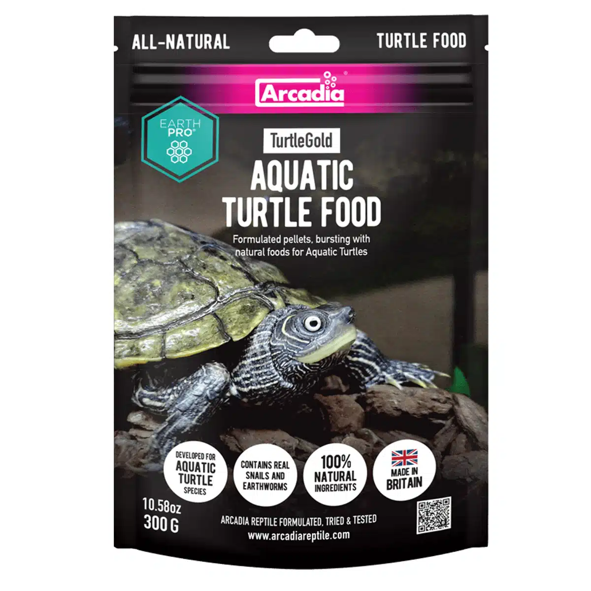 Arcadia EarthPro TurtleGold is a natural, balanced pelleted diet for aquatic turtles, terrapins and other water-dwelling species. Made in the UK using a highly varied whole-food blend, it includes fish meal, shrimp, insects, aquatic invertebrates, plant matter, algae, snails and earthworms — providing a nutrient-rich diet close to what turtles would encounter in the wild.