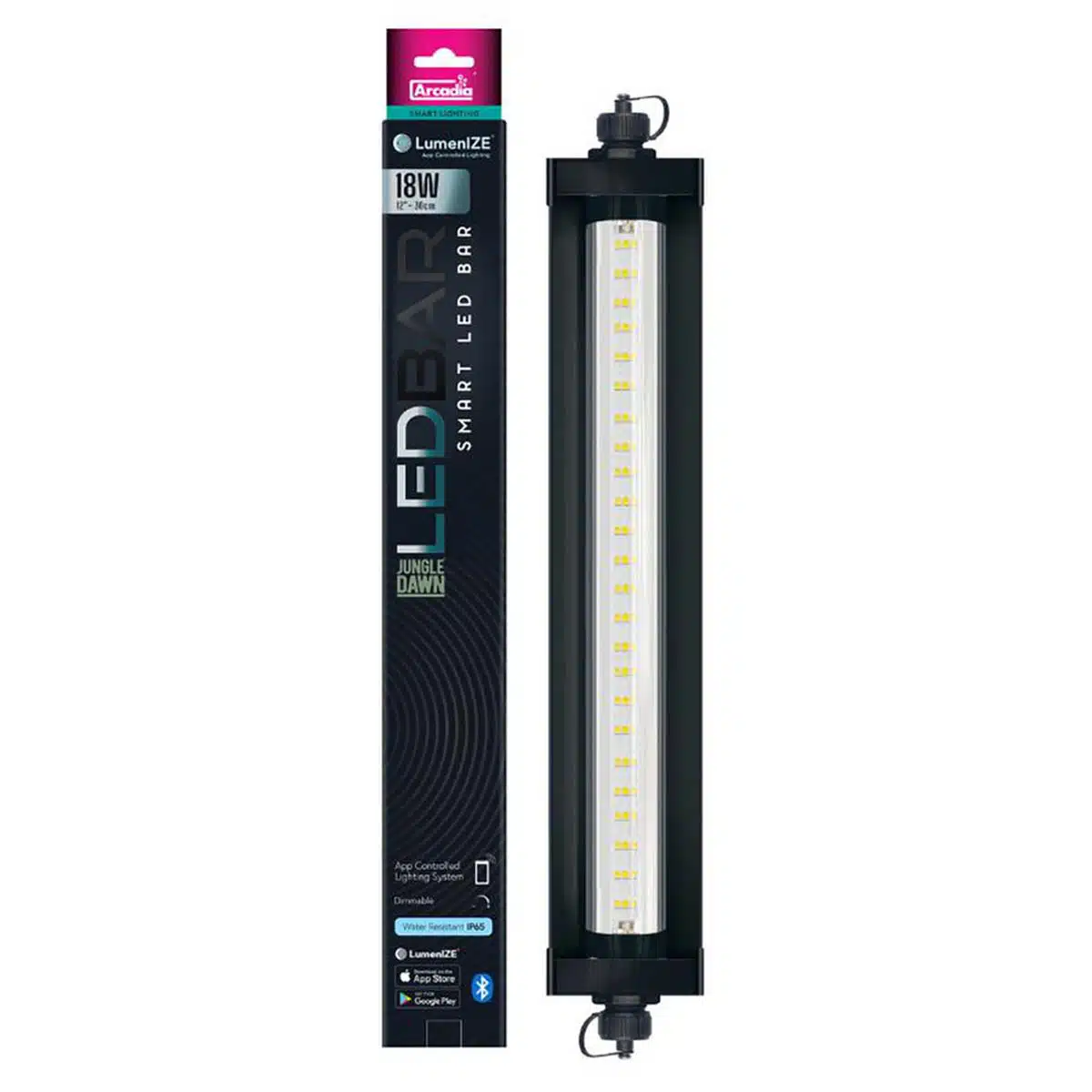The Arcadia LumenIZE Jungle Dawn LED Bar 18W is a high-output, full-spectrum LED lighting system with advanced app-controlled dimming, designed to dramatically increase visible light levels in reptile enclosures while offering precise control over daily lighting cycles. It delivers intense, natural illumination that supports plant growth, bioactive systems, and natural reptile behaviour through high-quality visible light across the full terrestrial spectrum.