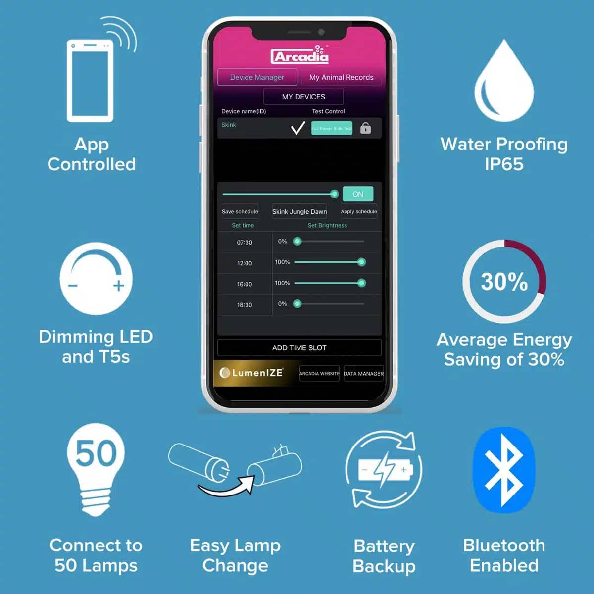 The Arcadia LumenIZE Pro T5 Forest 6% UVB Kit provides gentle but biologically effective UVB for forest and arboreal reptiles. Designed to replicate filtered woodland sunlight, this professional HO-T5 system offers digital dimming, sunrise and sunset simulation, and improved energy efficiency.