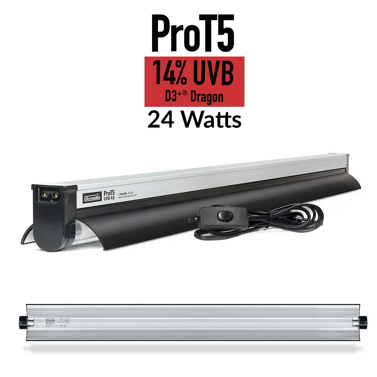 The Arcadia ProT5 UVB Dragon 24w Kit arrives complete with high quality electronics, a highly effective and removable reflector and a 14% T5 UVB Dragon Lamp.