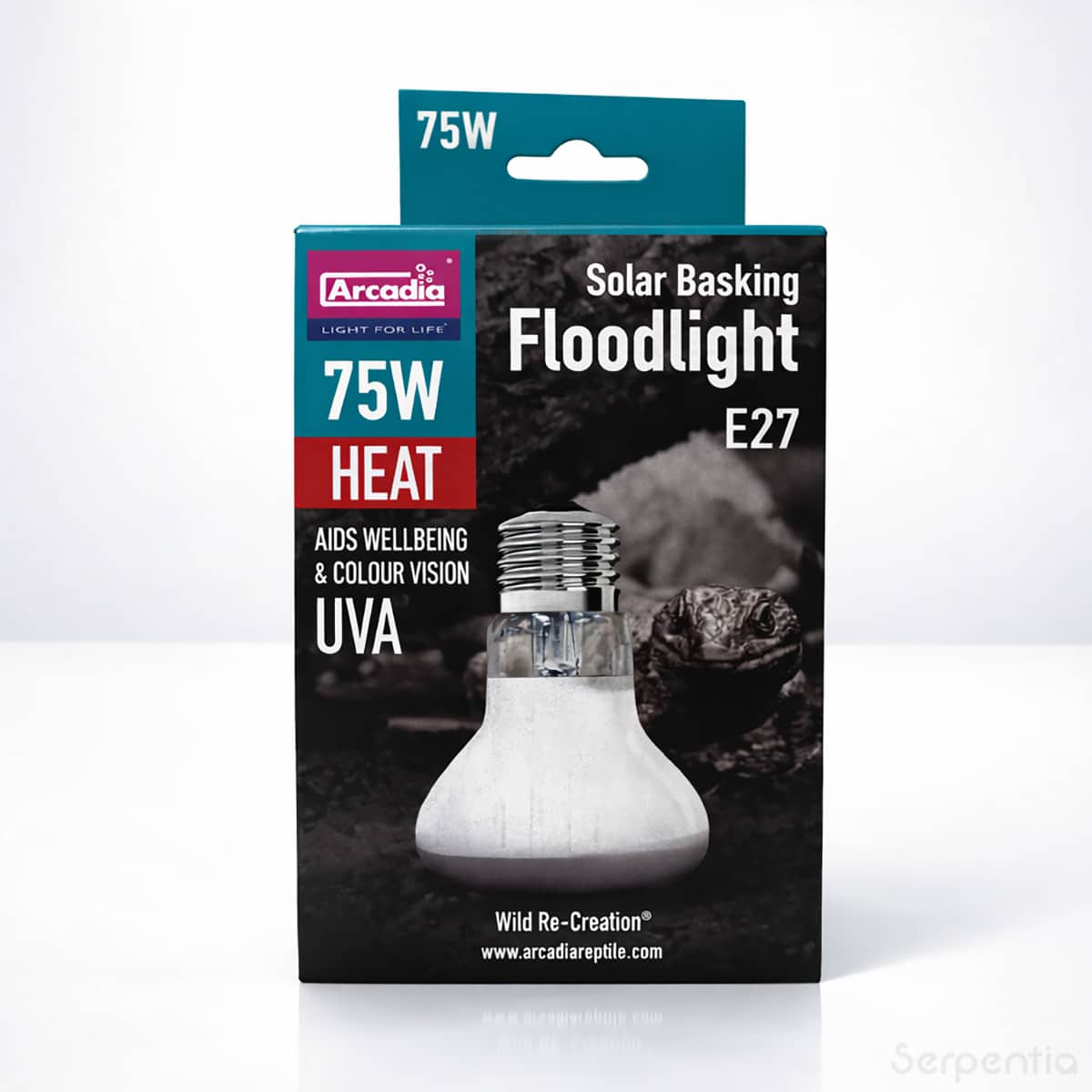 The Arcadia Solar Basking Floodlight – 75 W is a wide-beam reptile basking bulb that provides a natural spread of warm-colour heat, raising ambient temperatures and creating a realistic basking area for reptiles and amphibians.