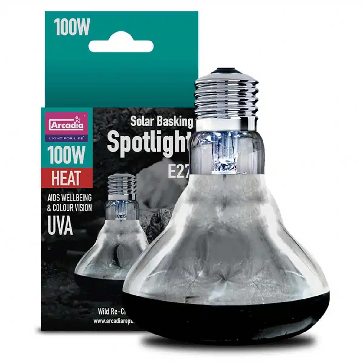 Arcadia Solar Basking Spotlight – 100 W provides a tight, focused beam of radiant heat, delivering an intense basking zone for reptiles that rely on high surface temperatures.
