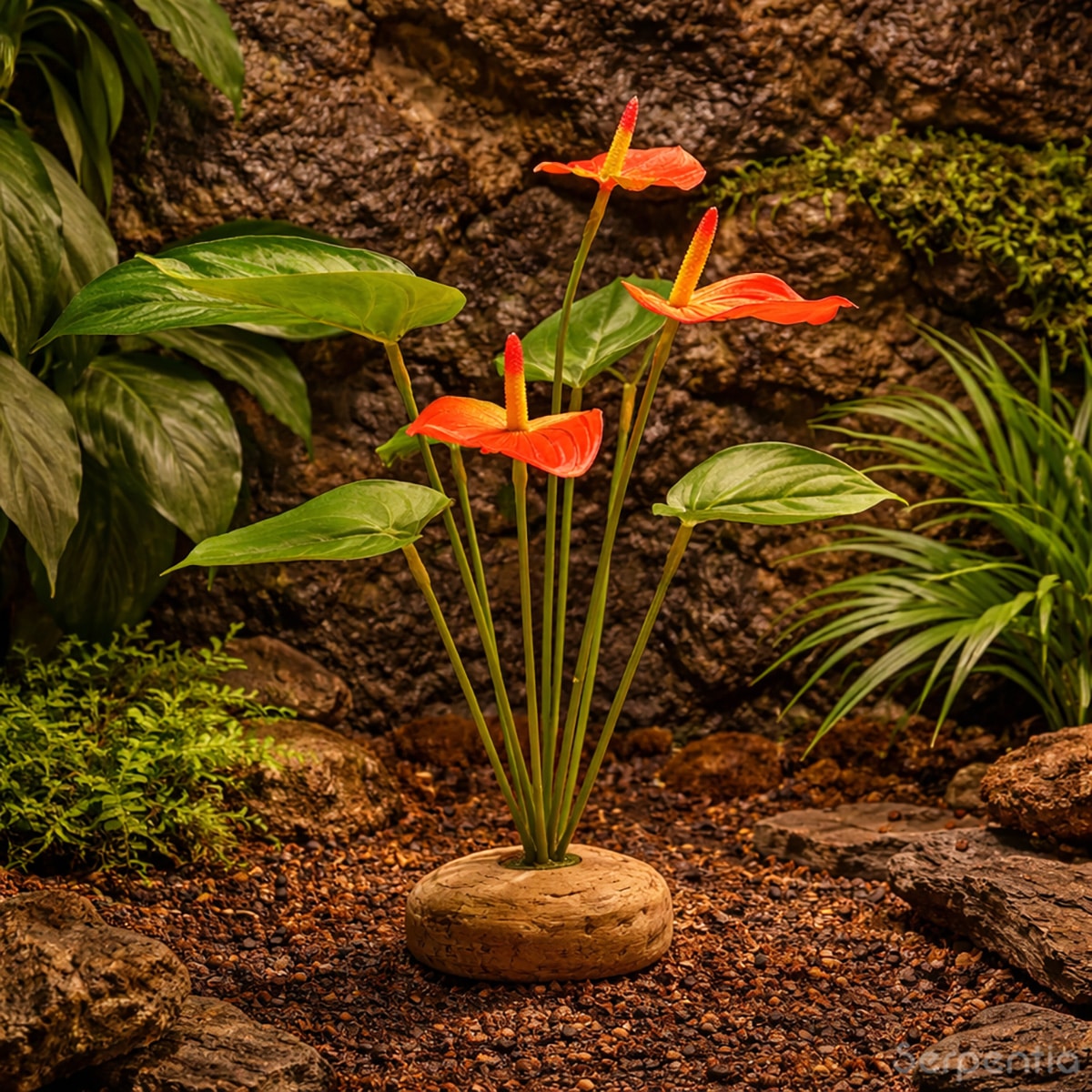This artificial Anthurium bush contributes to environmental enrichment by providing shaded areas, resting spots, and visual cover. These features encourage natural behaviours such as hiding, exploring, and climbing, helping reptiles and amphibians feel more secure within their enclosure.