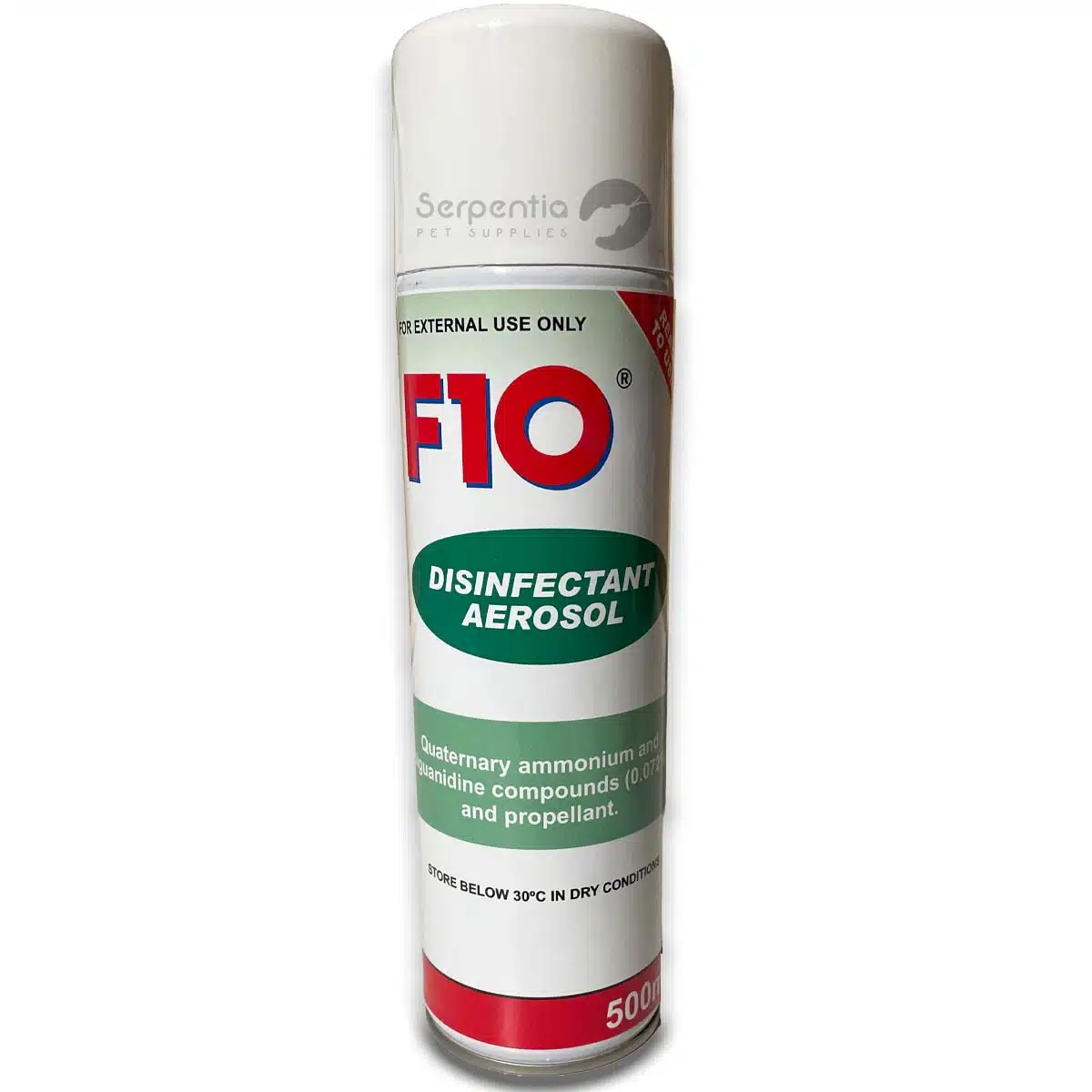 A 500ml aerosol canister, filled with F10SC disinfectant at a dilution (1:80) proven effective against all known types of pathogen – including high resistant viruses such as Circovirus (PBFD) or Parvovirus.