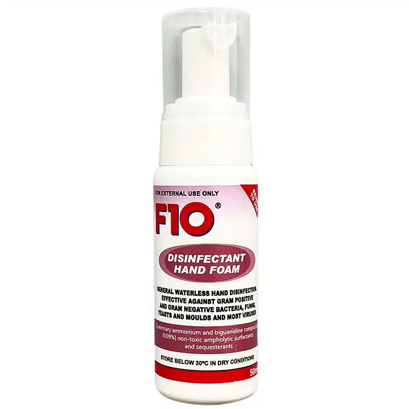 F10 Disinfectant Hand Foam is enriched with emollients to prevent hands drying out and enable frequent use and is graded ‘zero’ for dermal irritation.