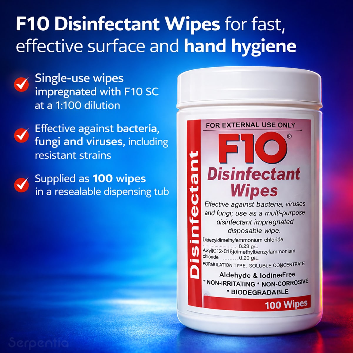 Biodegradable F10 disinfectant wipes for fast, effective surface and hand hygiene.