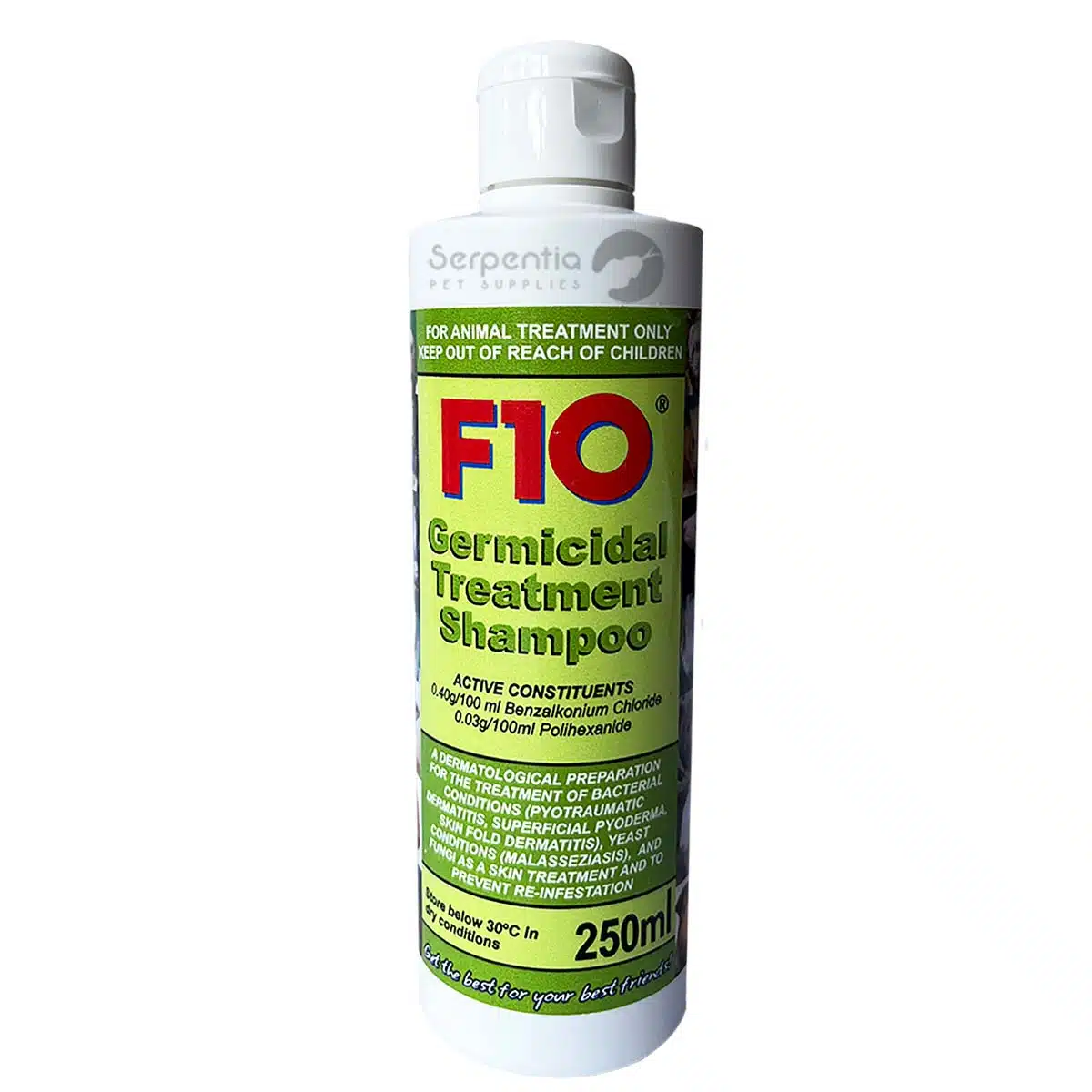 - For heavily soiled coats it may be necessary to first wash using an F10 shampoo to break down the natural oils in the coat. Wash off and immediately wash with the F10 Germicidal Treatment Shampoo.