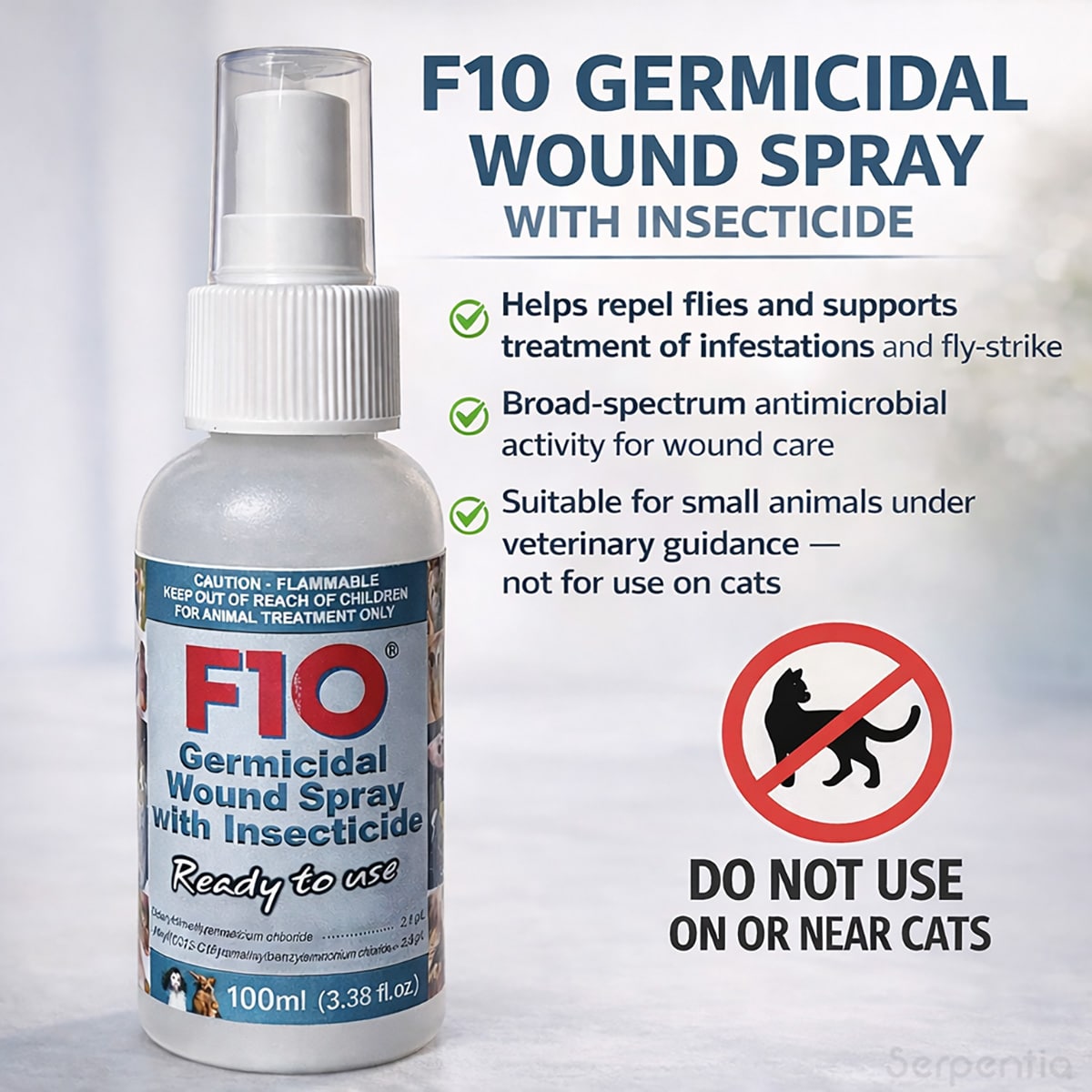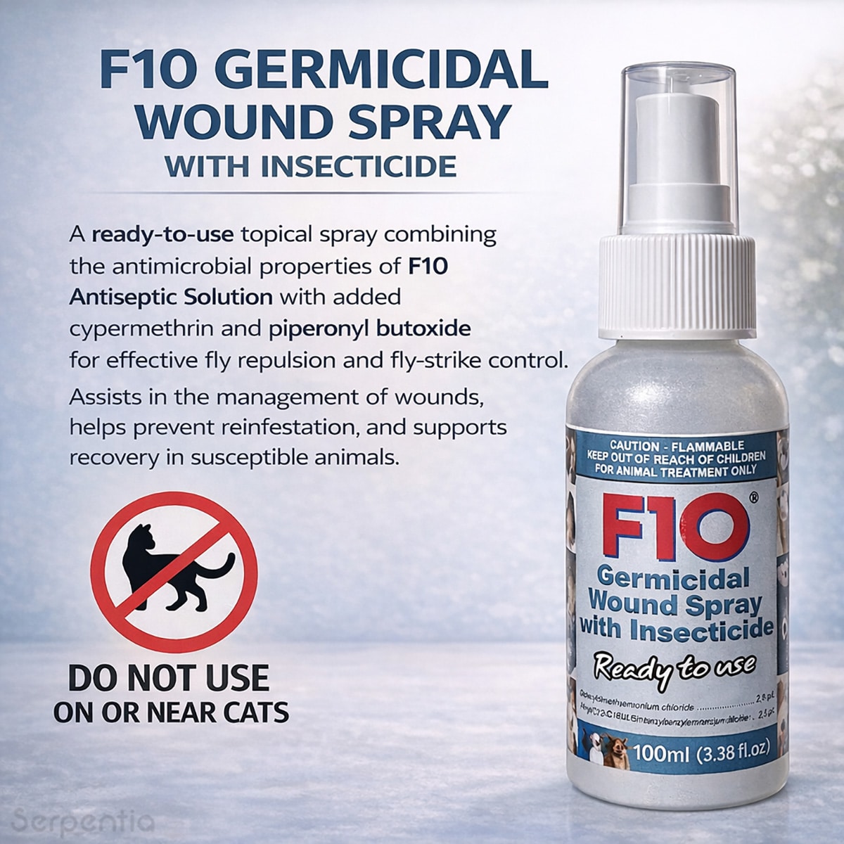 F10 Germicidal Wound Spray with Insecticide is a ready-to-use topical spray combining the antimicrobial properties of F10 Antiseptic Solution with added cypermethrin and piperonyl butoxide for effective fly repulsion and fly-strike control. It is designed to assist in the management of wounds, help prevent reinfestation, and support recovery in susceptible animals.