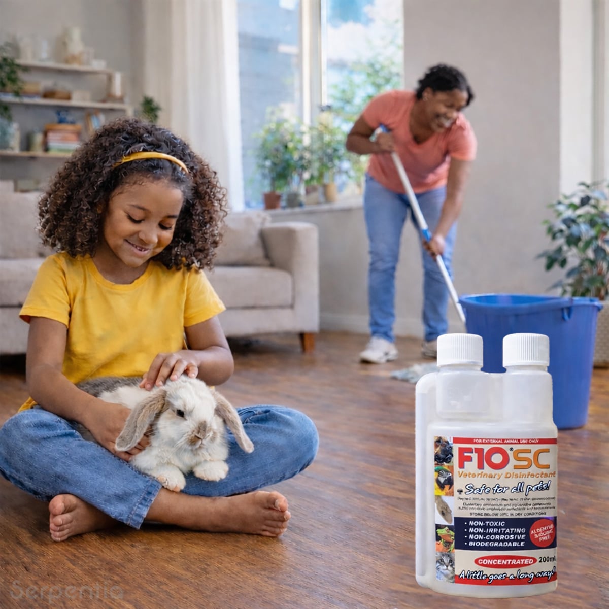 At recommended working dilutions, F10 SC is non-corrosive, non-toxic, non-tainting and non-irritating. It contains no chlorine or aldehydes and is safe to use in the presence of animals when applied according to directions. For best results, apply to a clean surface and allow to air dry.