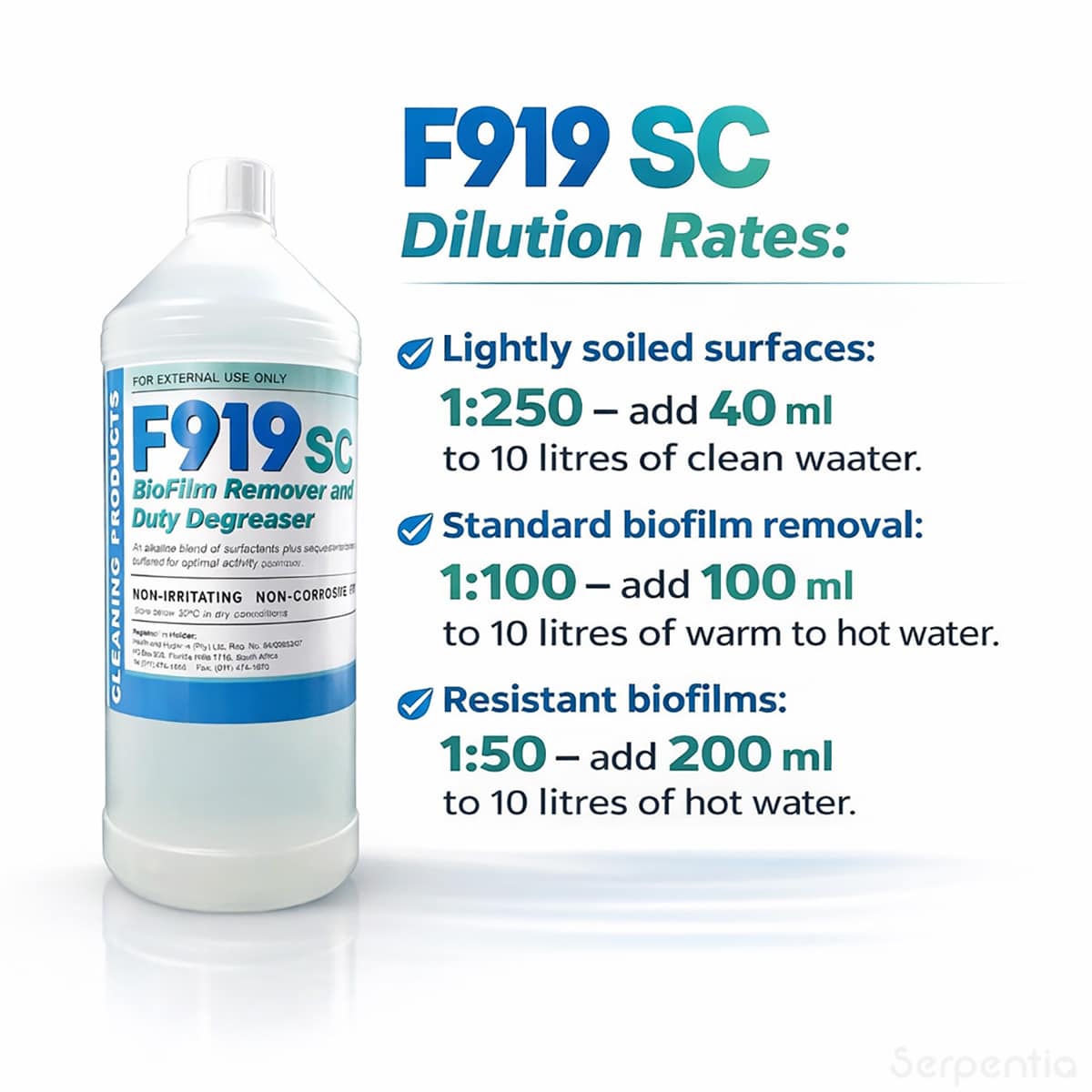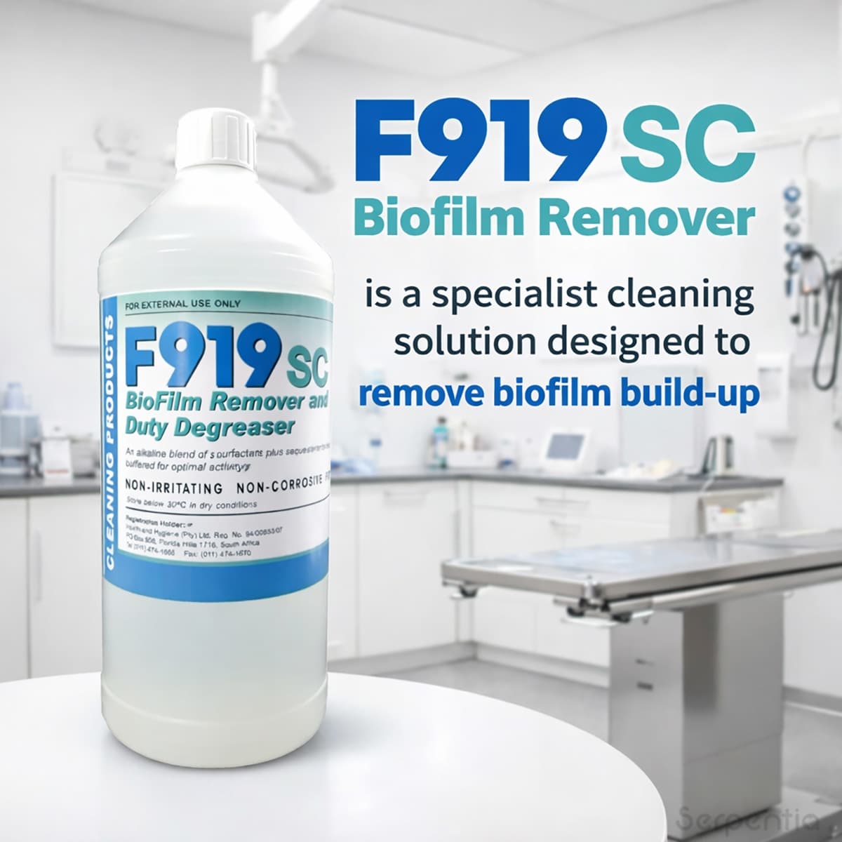 F919SC is ideal for use on surfaces, equipment and water systems where biofilm build-up may occur. Regular use helps maintain clean environments and improves the effectiveness of routine disinfection protocols.