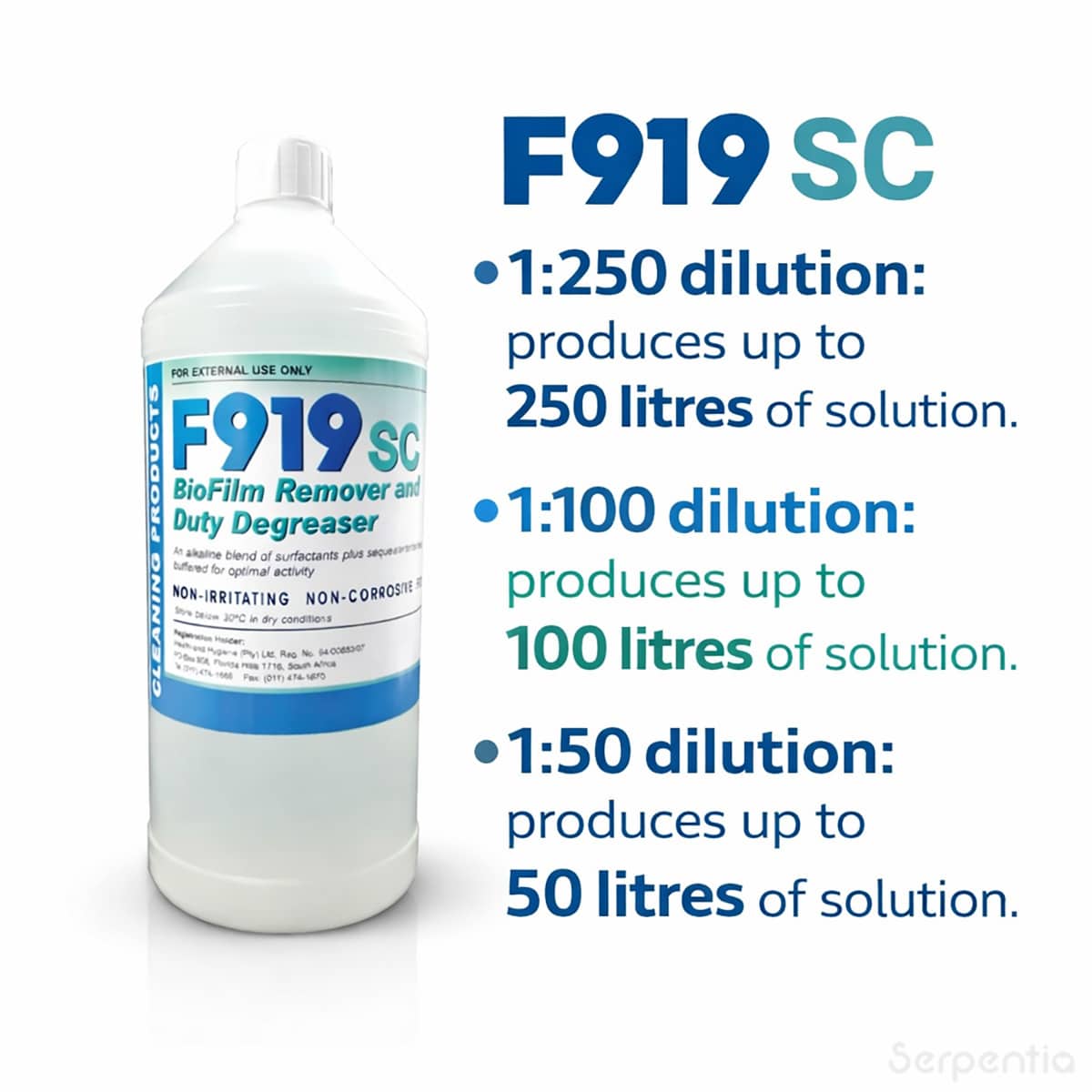 A single 1 litre bottle of F919SC concentrate produces large volumes of usable cleaning solution depending on the dilution used.