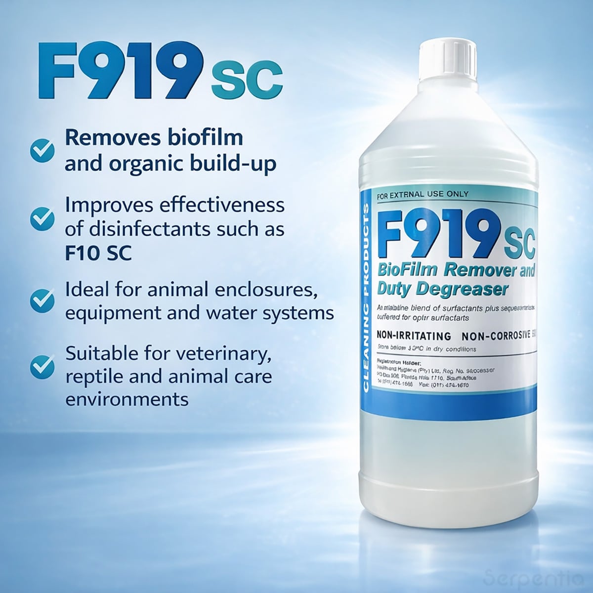 By removing this protective biofilm layer, F919SC helps ensure that disinfectants such as F10 SC Veterinary Disinfectant can work effectively. This makes it particularly valuable in veterinary clinics, breeding facilities, reptile enclosures, aviaries and other animal housing where high levels of hygiene and biosecurity are required.
