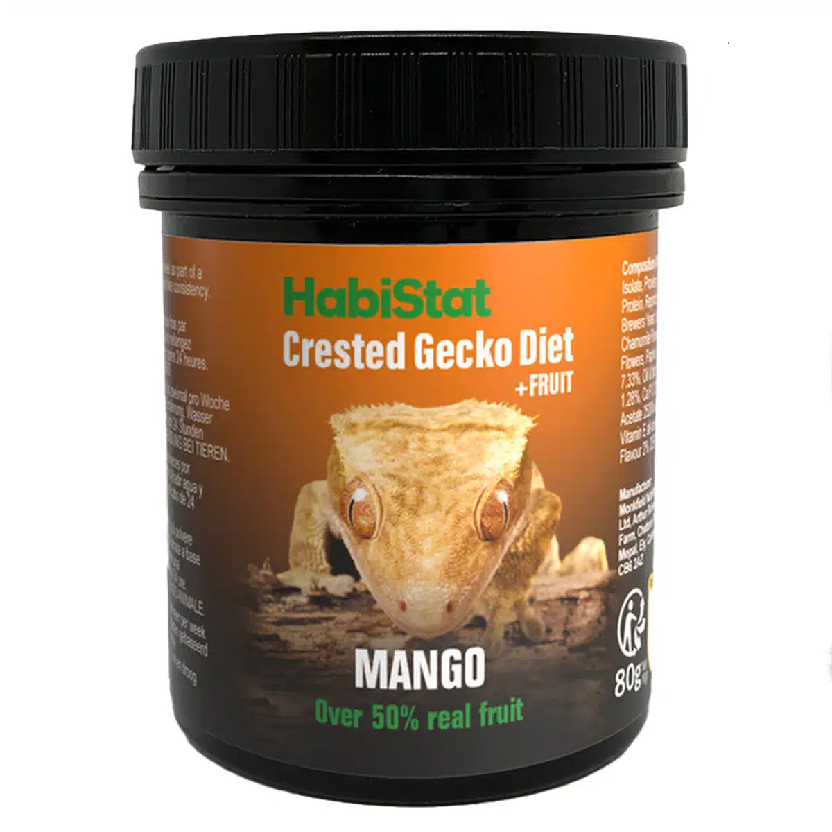 HabiStat Crested Gecko Diet – Mango is a natural, fruit-rich blend made with over 50% real mango and absolutely no artificial colours, flavours, preservatives or fillers. Its smooth tropical formula provides a balanced mix of plant nutrients, natural sugars and 9 key protein sources. Ideal as part of a varied feeding routine for fruit- and insect-eating reptiles that benefit from a sweet, highly palatable diet.