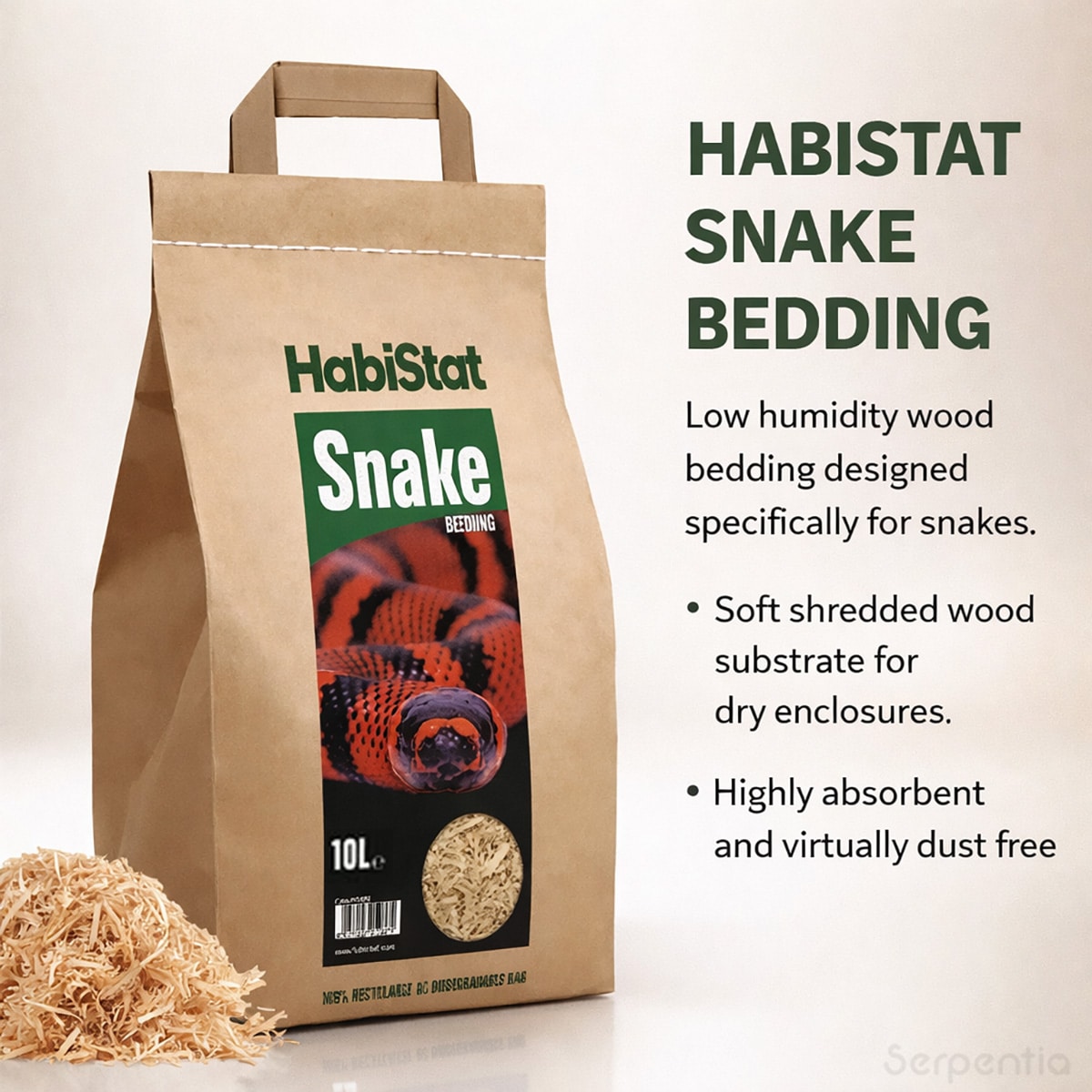 HabiStat Snake Bedding is a natural, low humidity reptile substrate made from soft shredded wood. It has been specifically designed for snake species that thrive in dry enclosure conditions and do not require elevated humidity.
