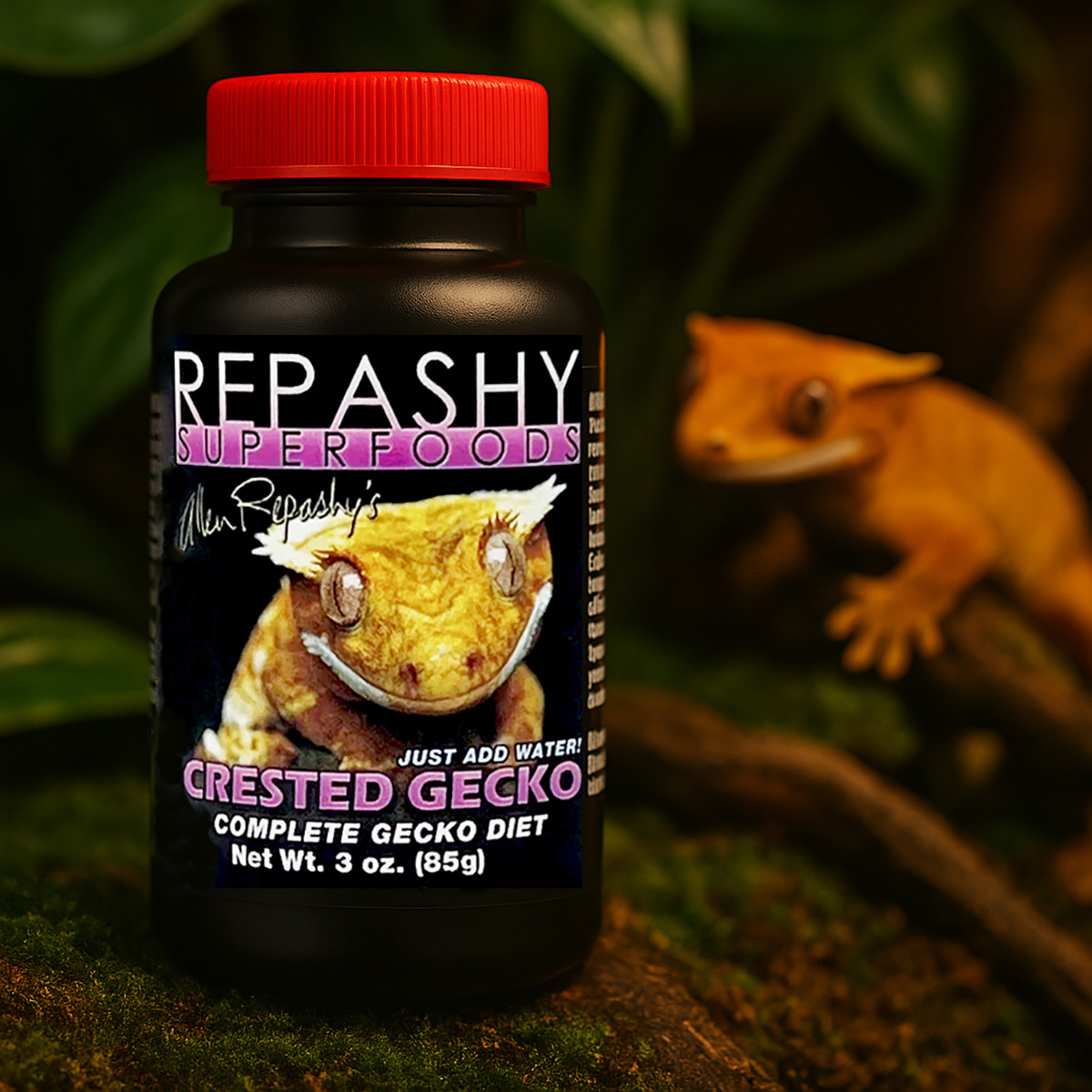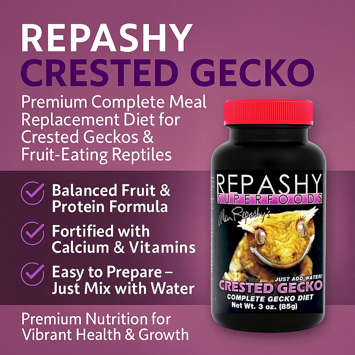 Repashy Crested Gecko Diet is a premium complete meal replacement powder designed for Crested, Gargoyle, Chahoua (Mossy), and other fruit-eating geckos.