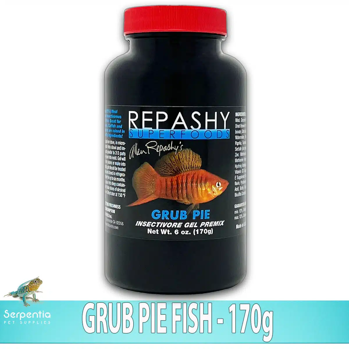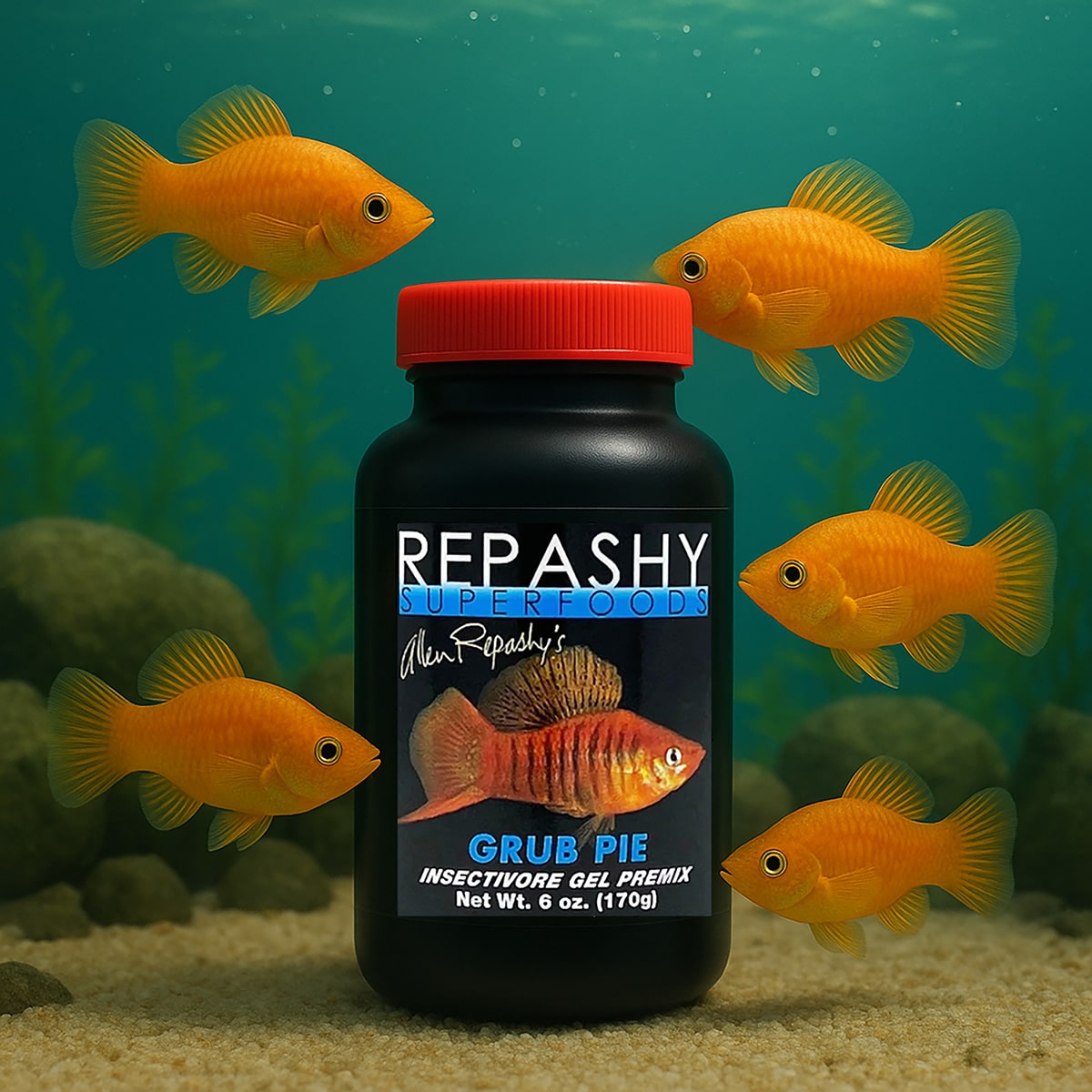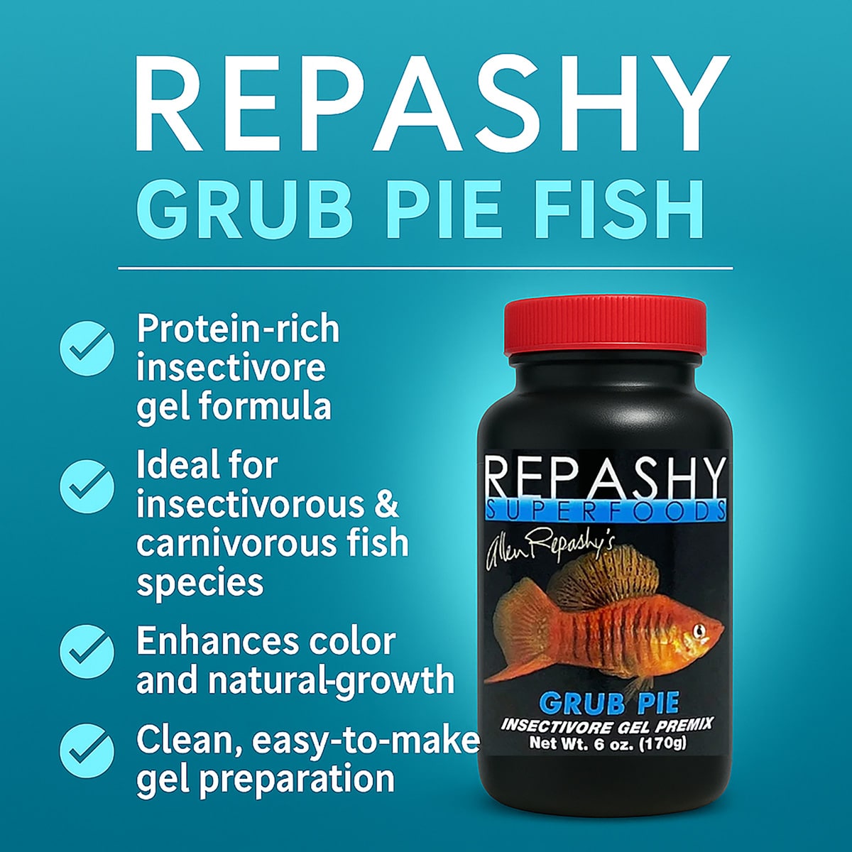 Repashy Fish Food Grub Pie is a complete insect-based gel premix designed for insectivorous and omnivorous freshwater fish such as Bettas, Livebearers, Gouramis, Catfish, Cichlids, and Barbs.