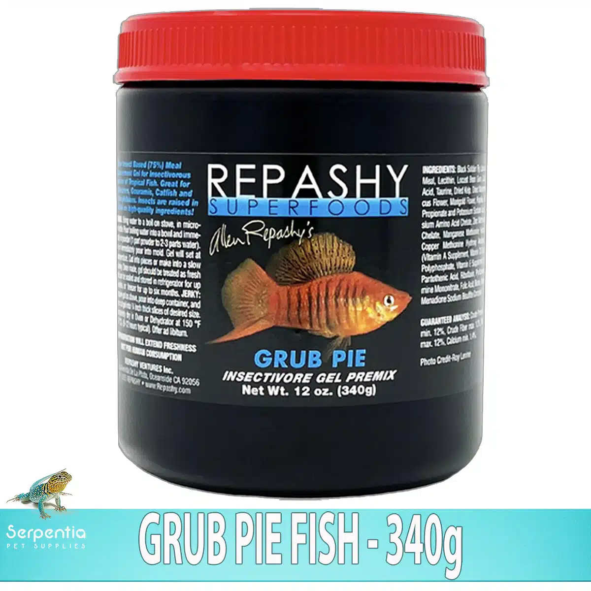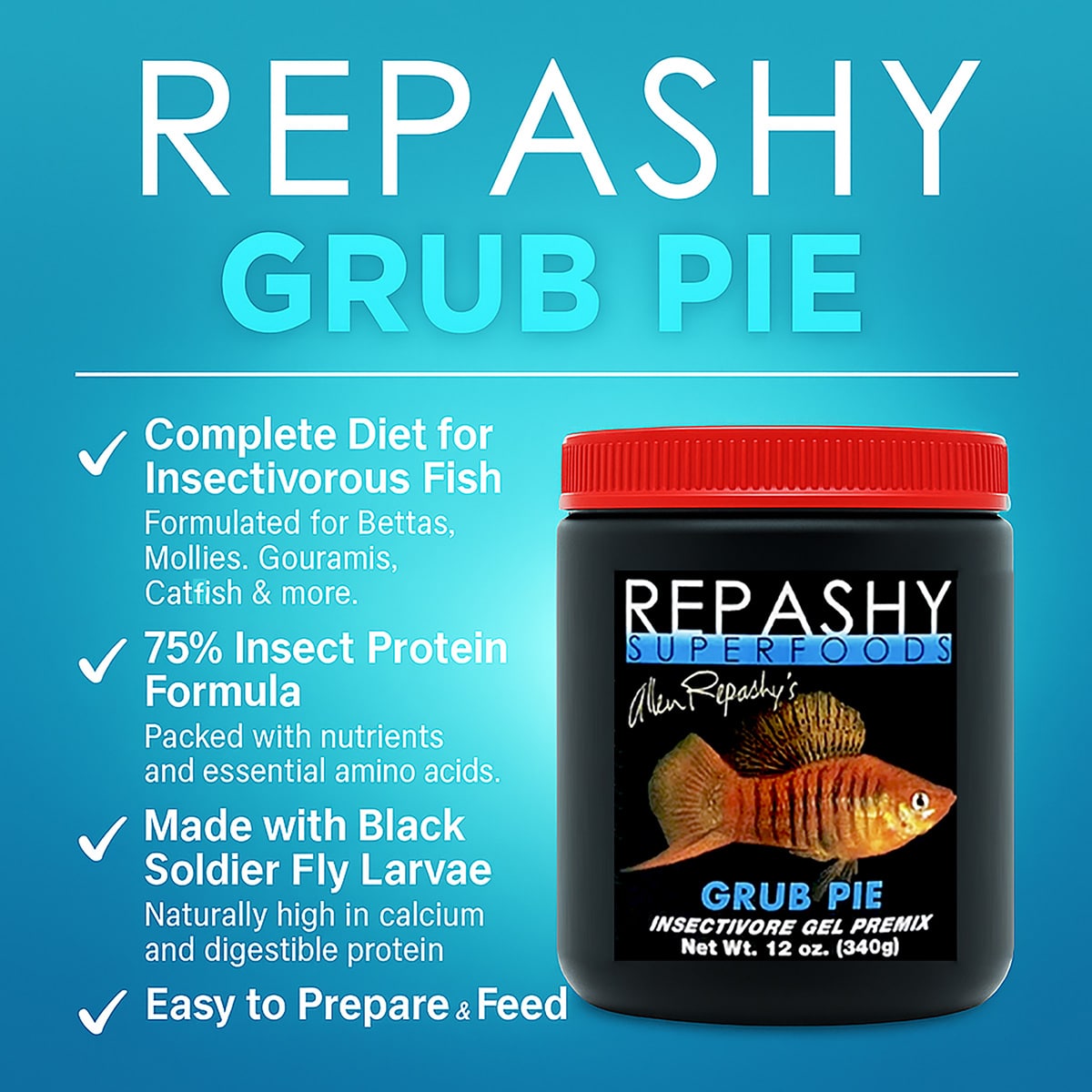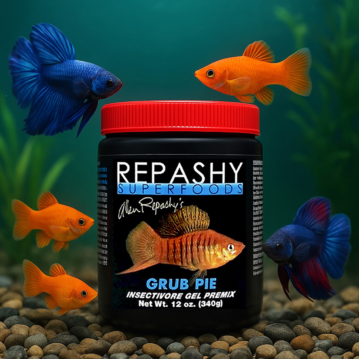 Repashy Fish Food Grub Pie is a complete insect-based gel premix designed for insectivorous and omnivorous freshwater fish such as Bettas, Livebearers, Gouramis, Catfish, Cichlids, and Barbs.
