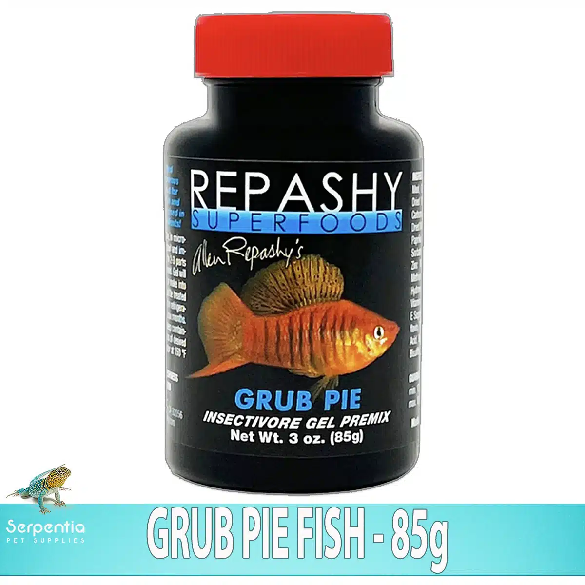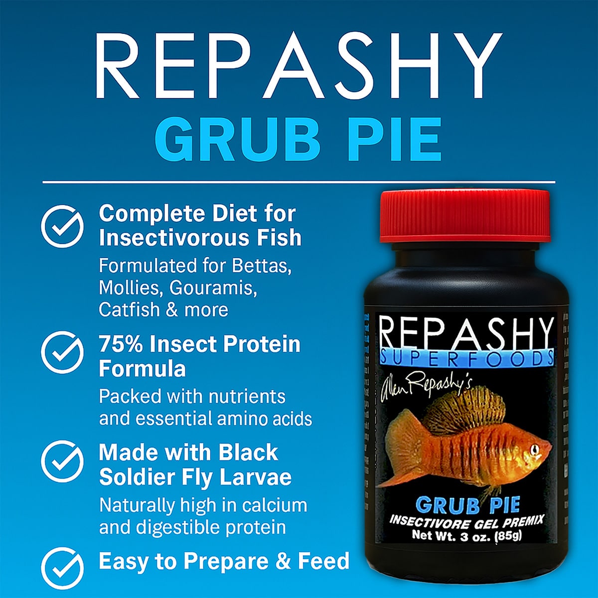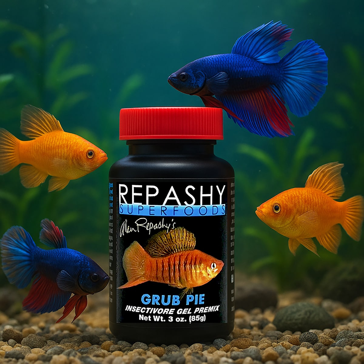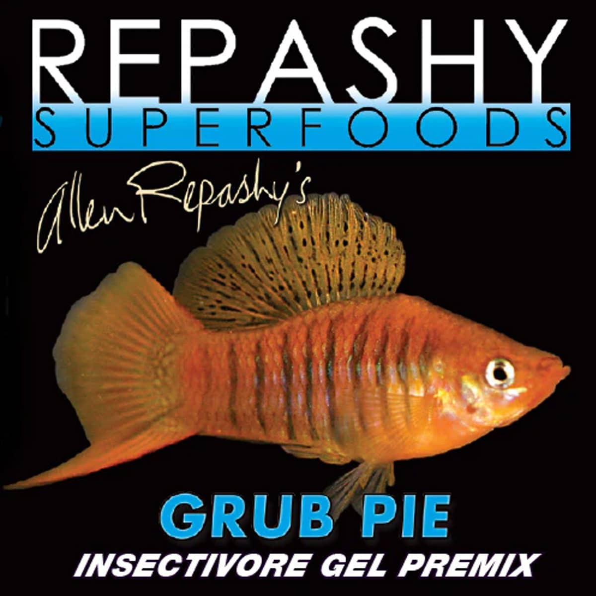 Repashy Fish Food Grub Pie is a complete insect-based gel premix designed for insectivorous and omnivorous freshwater fish such as Bettas, Livebearers, Gouramis, Catfish, Cichlids, and Barbs.