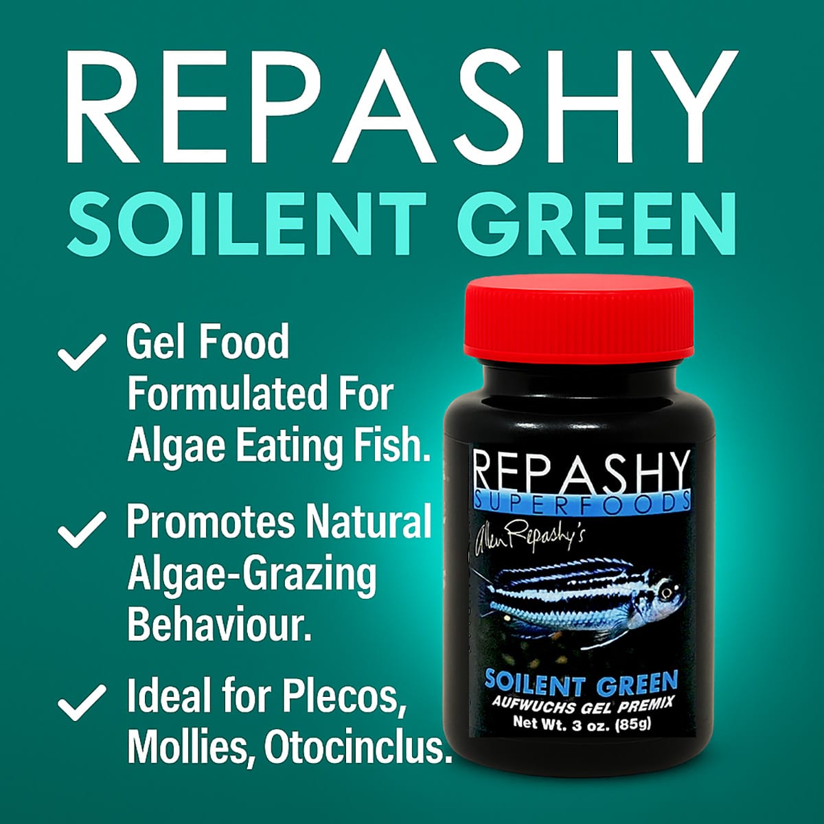 Repashy Soilent Green is designed for algae-eating and biofilm-grazing freshwater fish such as plecos, otocinclus, hillstream loaches, Siamese algae eaters, and mollies.