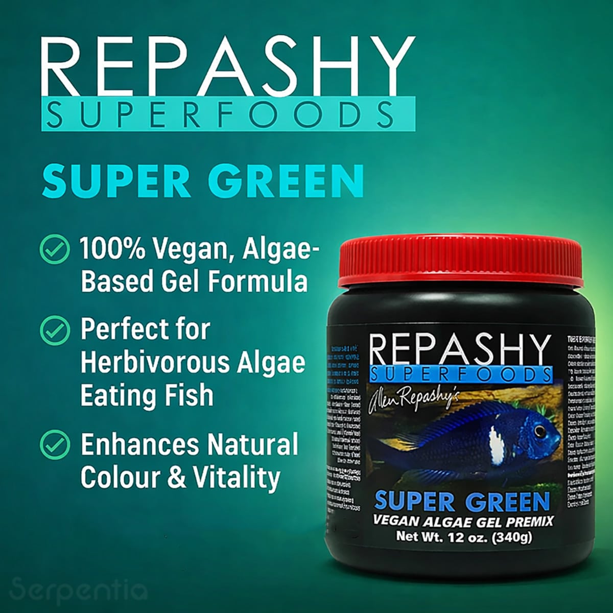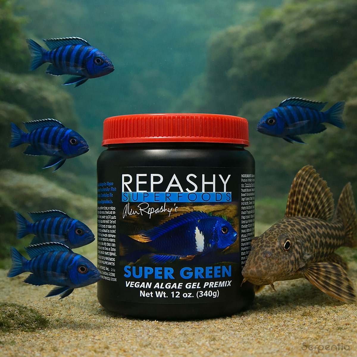 Repashy Super Green provides plant-based, spirulina-rich nutrition that supports healthy digestion, colour, and grazing behaviour in herbivorous freshwater fish.