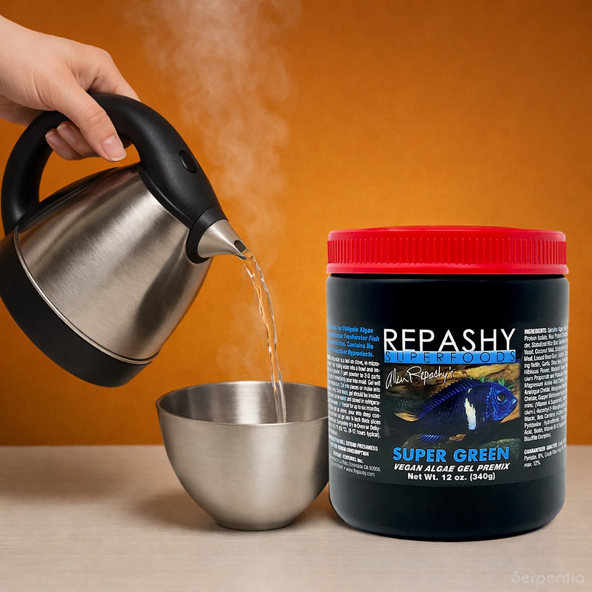 A spirulina-rich gel food for herbivorous and algae-grazing freshwater fish.