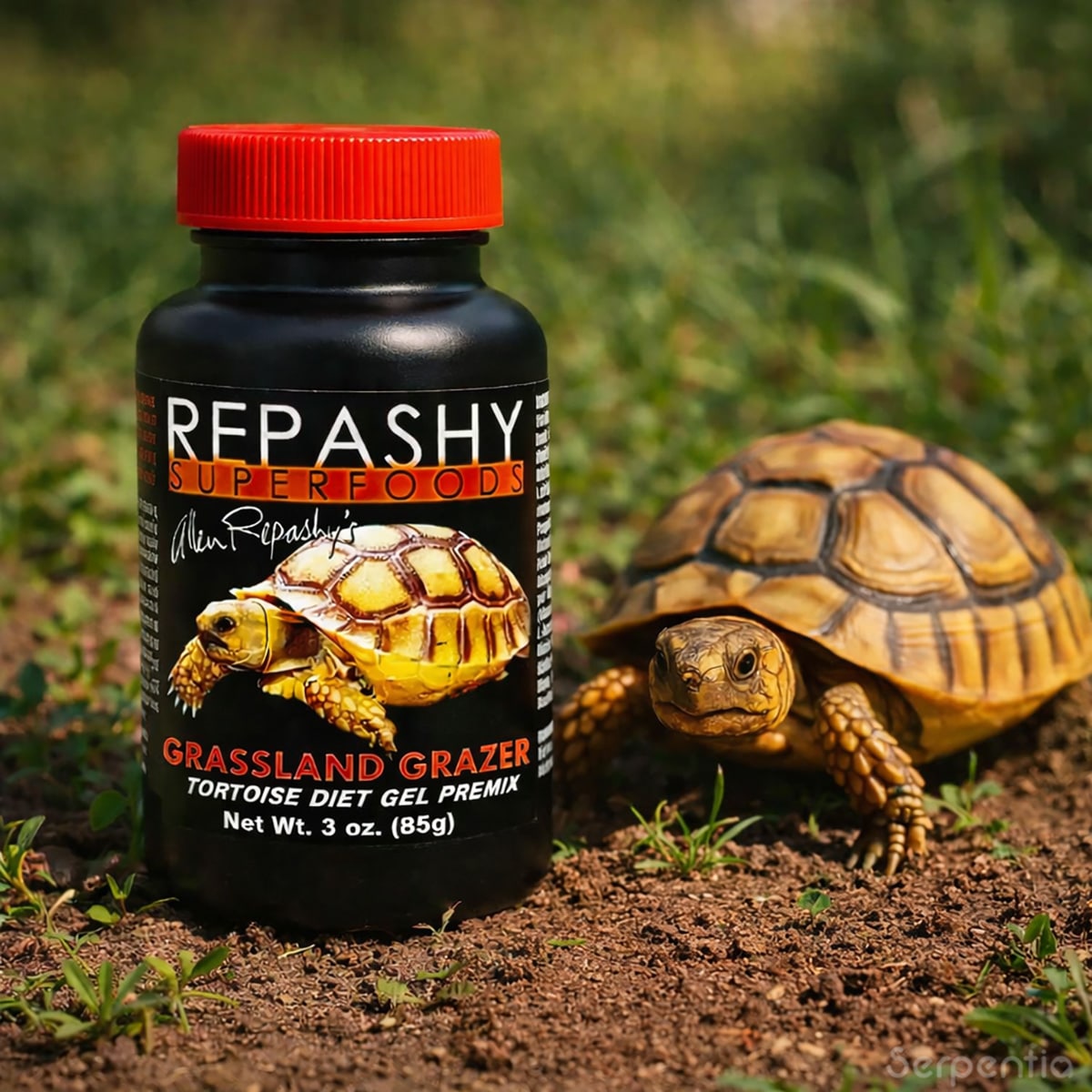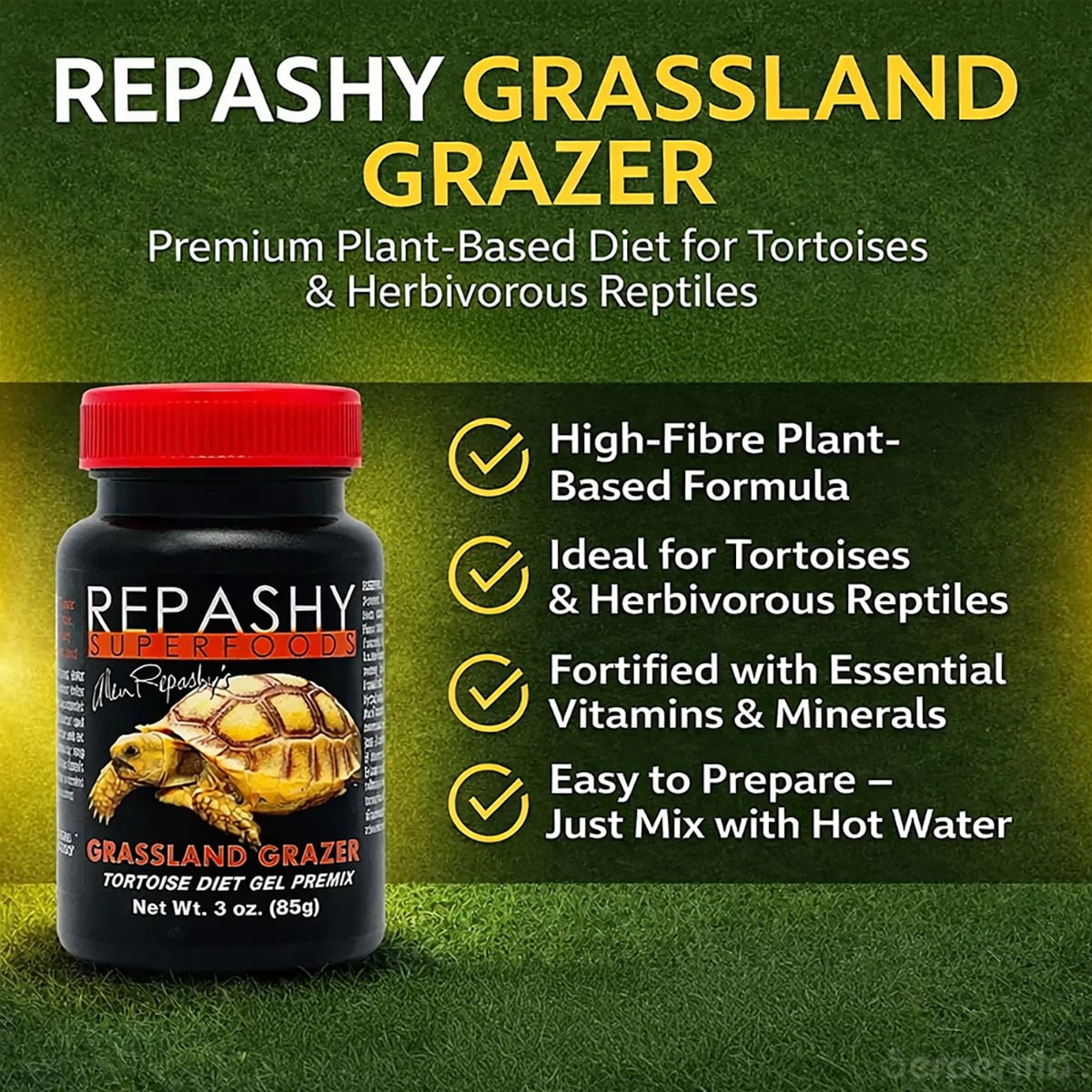 Repashy Grassland Grazer is a premium high-fibre gel diet designed for tortoises, Uromastyx, and other herbivorous reptiles that thrive on leafy greens, grasses, and low-protein plant matter.