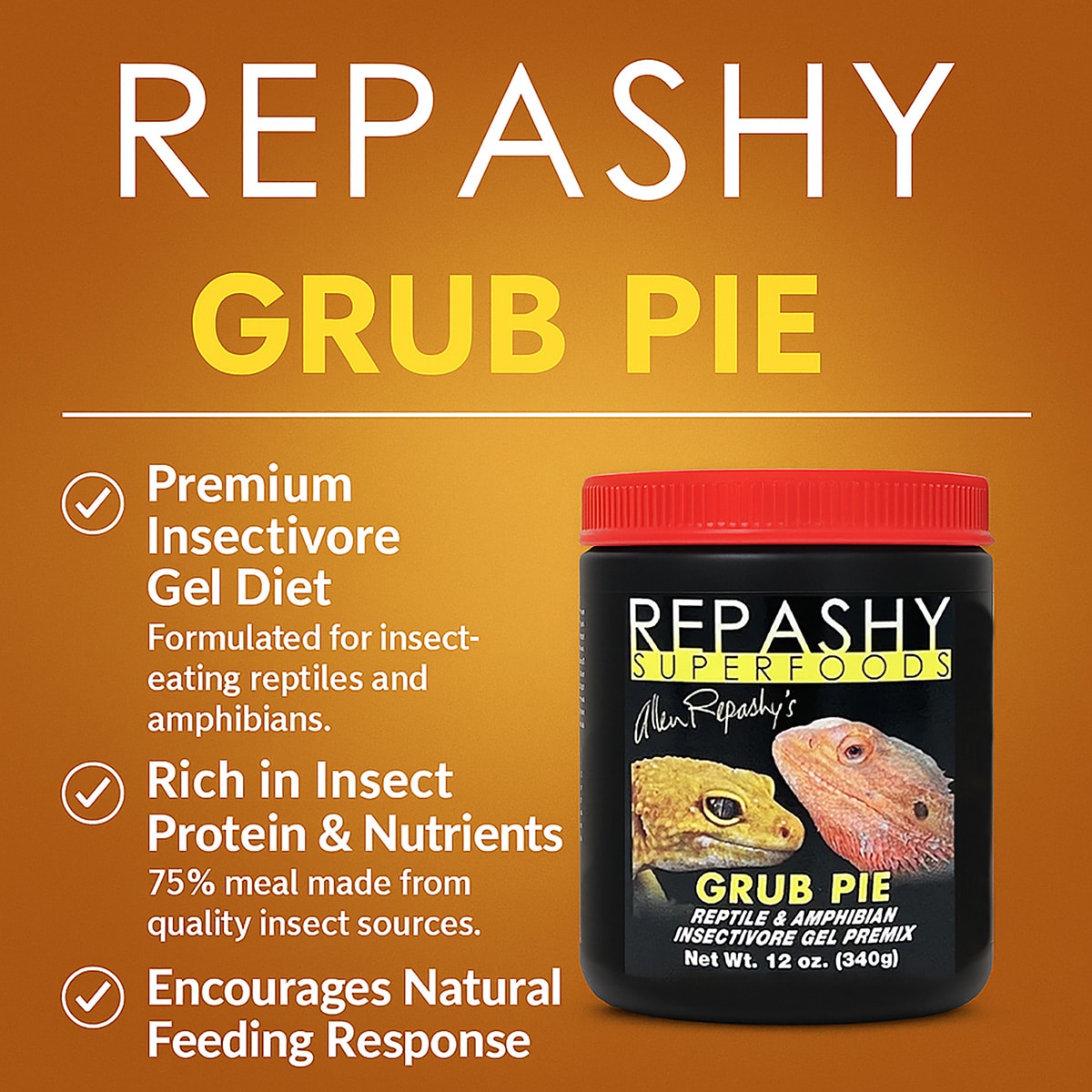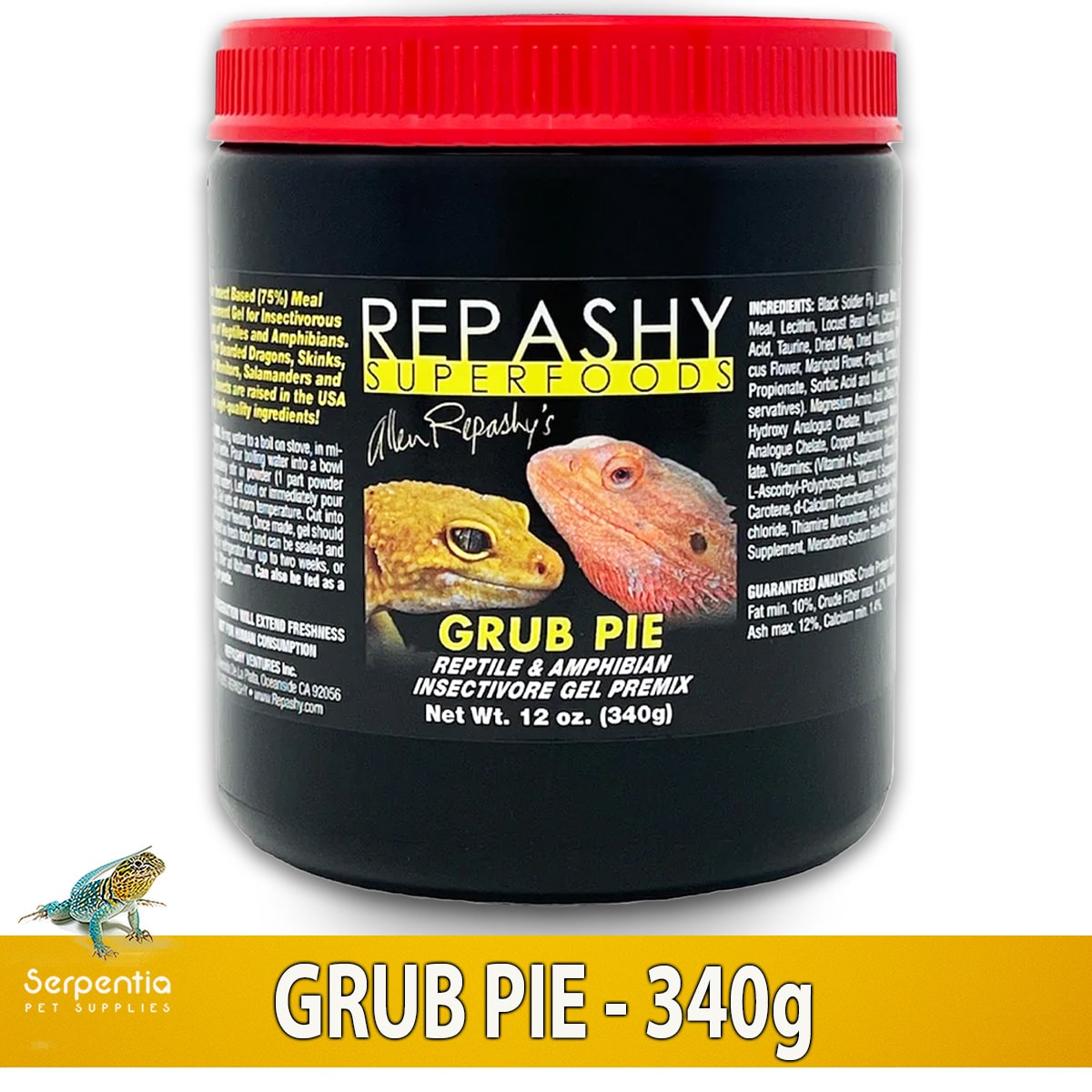 Grub Pie is particularly suited to Bearded Dragons, Blue Tongue Skinks, Leopard Geckos, African Fat-Tailed Geckos, Tegus, Monitors, Salamanders, and other reptiles and amphibians that thrive on insect-based diets.