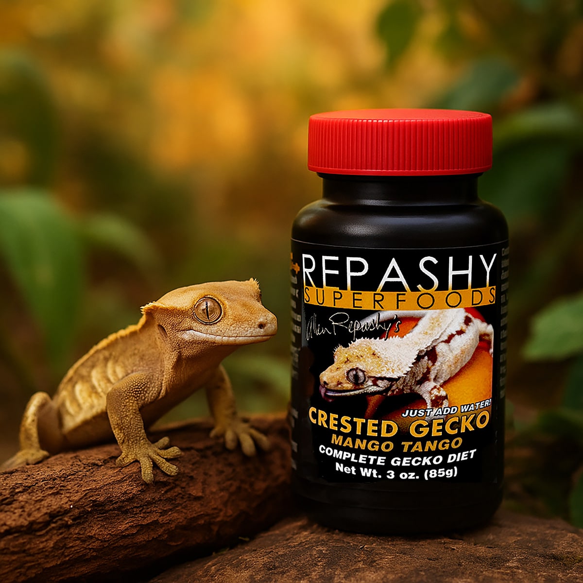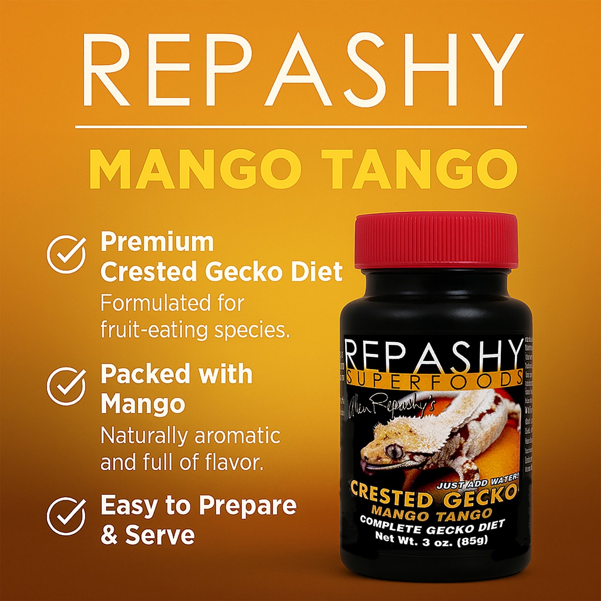 Repashy Mango Tango is a premium complete meal replacement powder designed for Crested, Gargoyle, Chahoua (Mossy), and other fruit-eating geckos.
