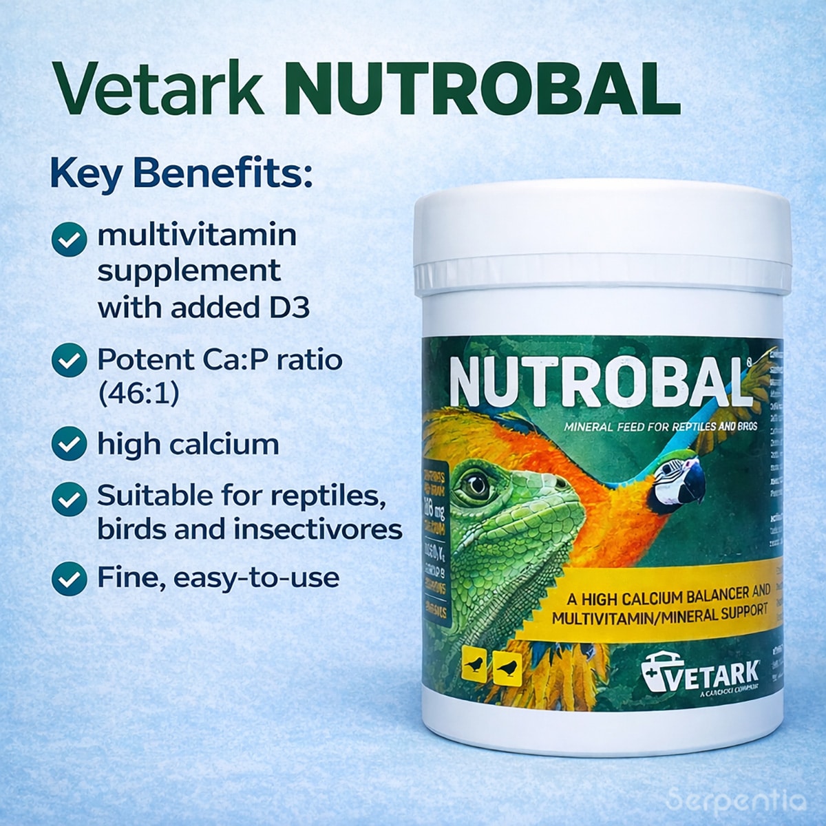 Nutrobal is suitable for reptiles, birds and insect-eating species that require additional calcium and vitamins in their diet.