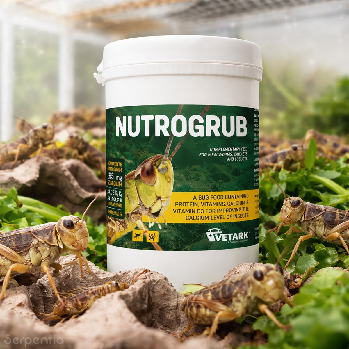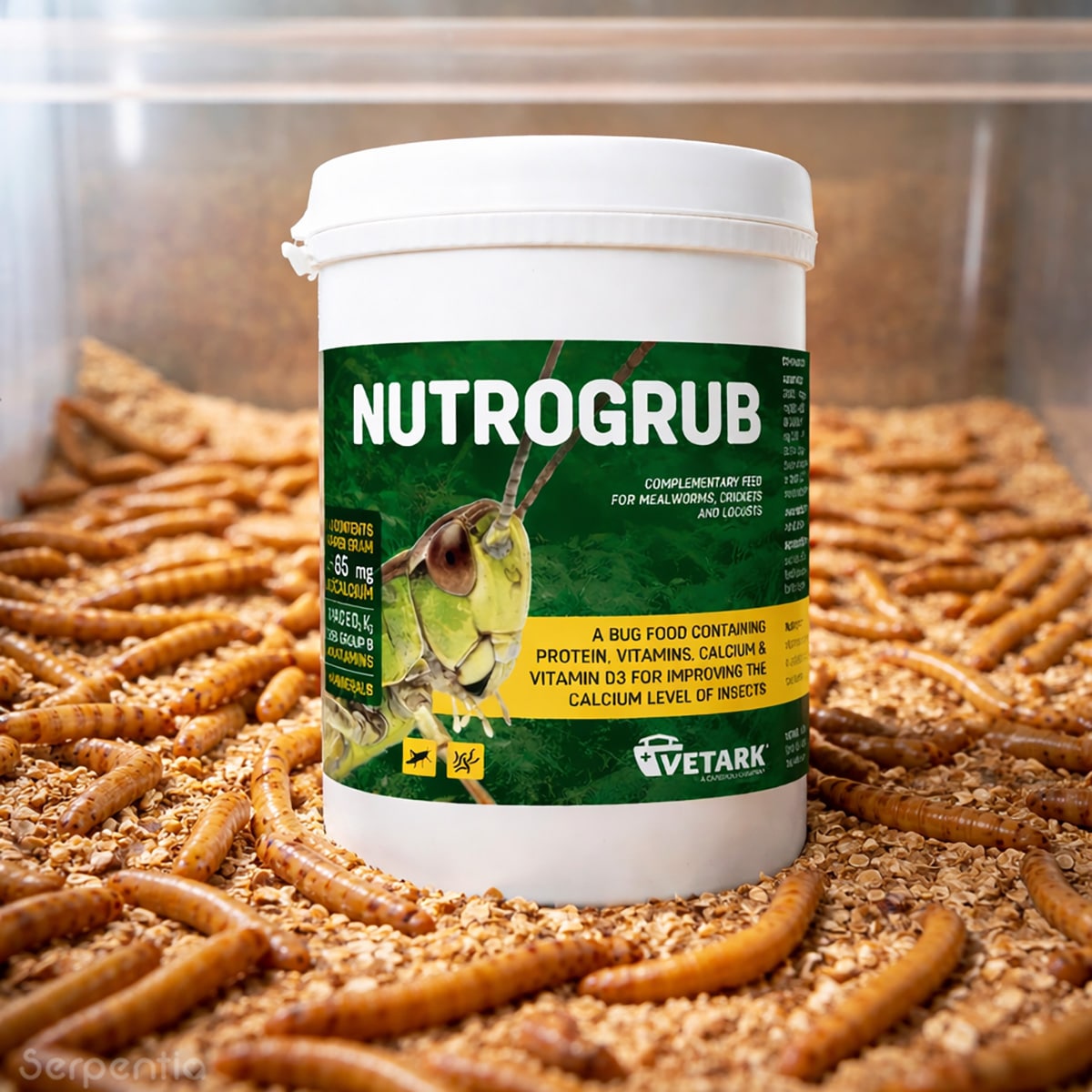 Vetark Nutrogrub is a complementary gut-loading food designed for feeder insects such as mealworms, crickets and locusts. It is based on a highly palatable vegetable protein source enriched with calcium, B vitamins, Nutrobal and calcium carbonate, helping improve the nutritional value of insects before they are fed to reptiles, birds and other insect-eating animals.